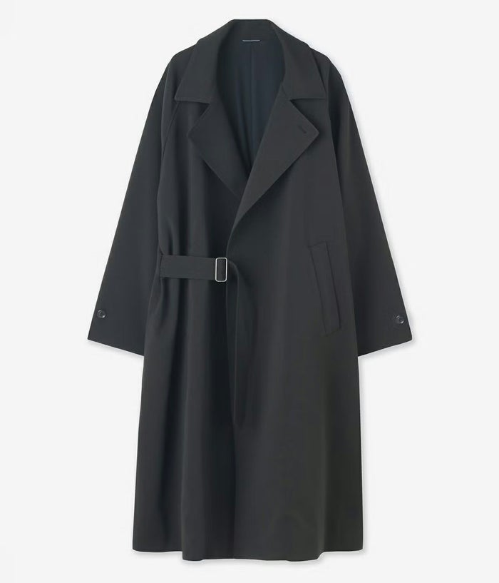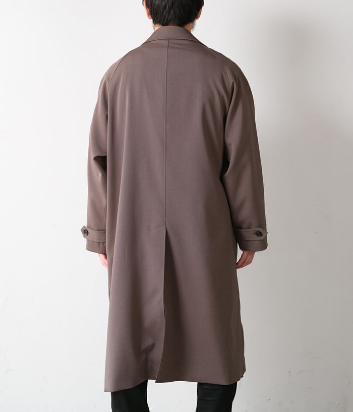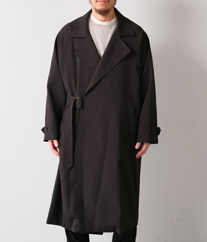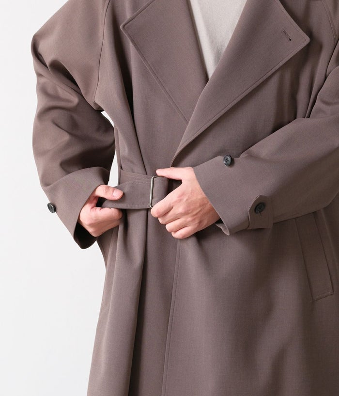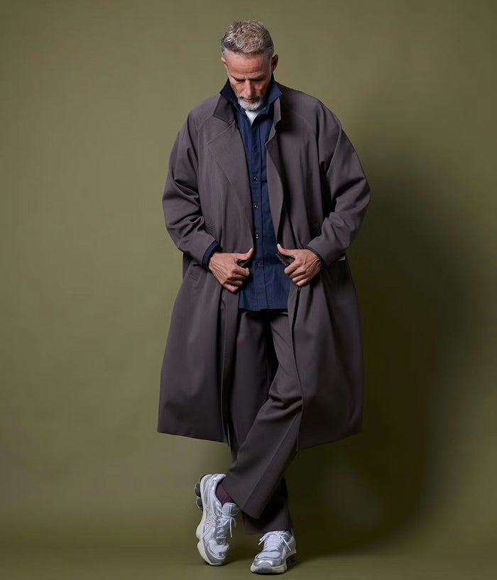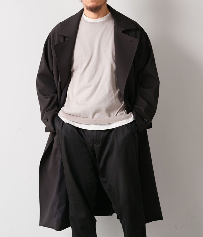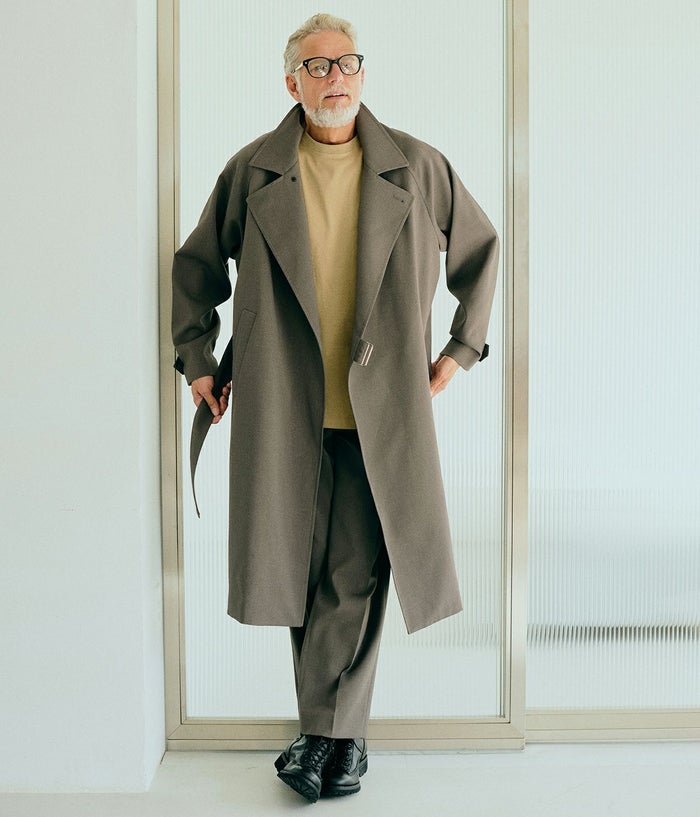 ルーズなシルエットを活かし、羽織るだけでスタイルに余裕を生み出すタイロッケンコート。