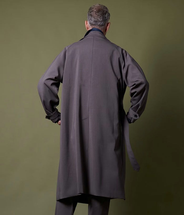 フロントを開けてラフに羽織ることも、ベルトを締めてシルエットに変化をつけることもでき、シーンや気分に合わせた着こなしが可能。背中部分と身頃裏で裏地を切り替えるなど、見えない部分にも細かな工夫を施しています。さらにベルトを内側に収納できるなど、実用性とデザイン性を兼ね備えたディテールも特徴です。