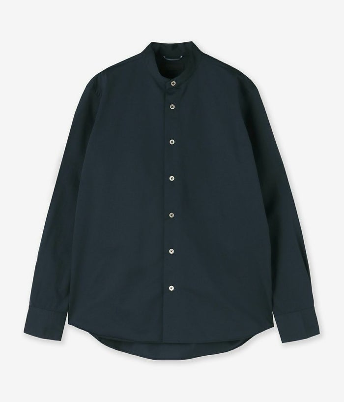 ゆったりとしたシルエットと長めの着丈が特徴のバンドカラーシャツ。シャツとしてはもちろん、軽い羽織りとしても活躍する一枚です。