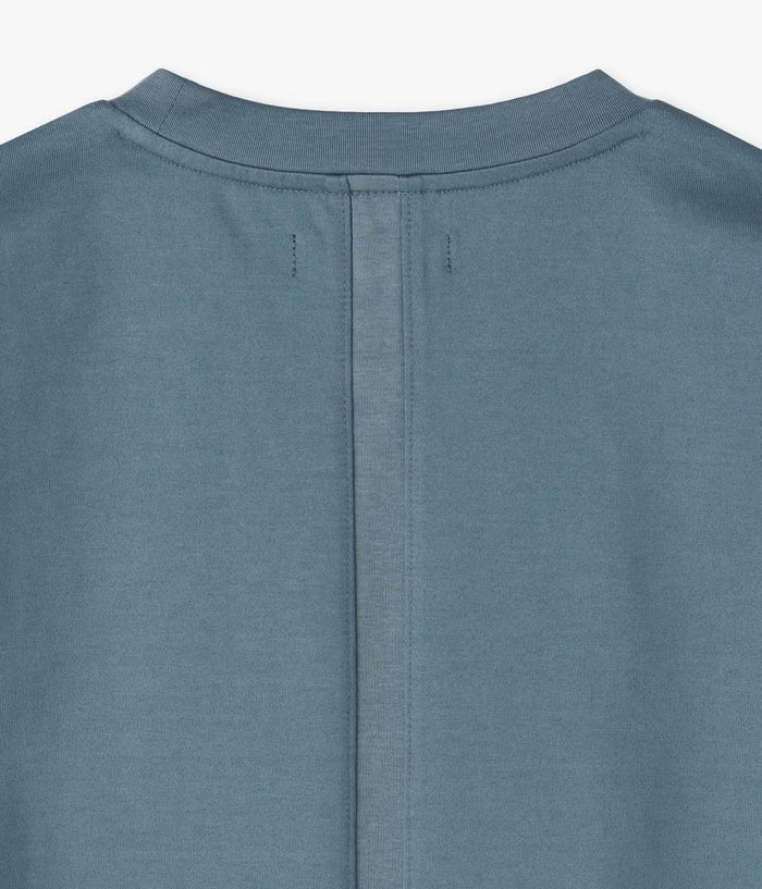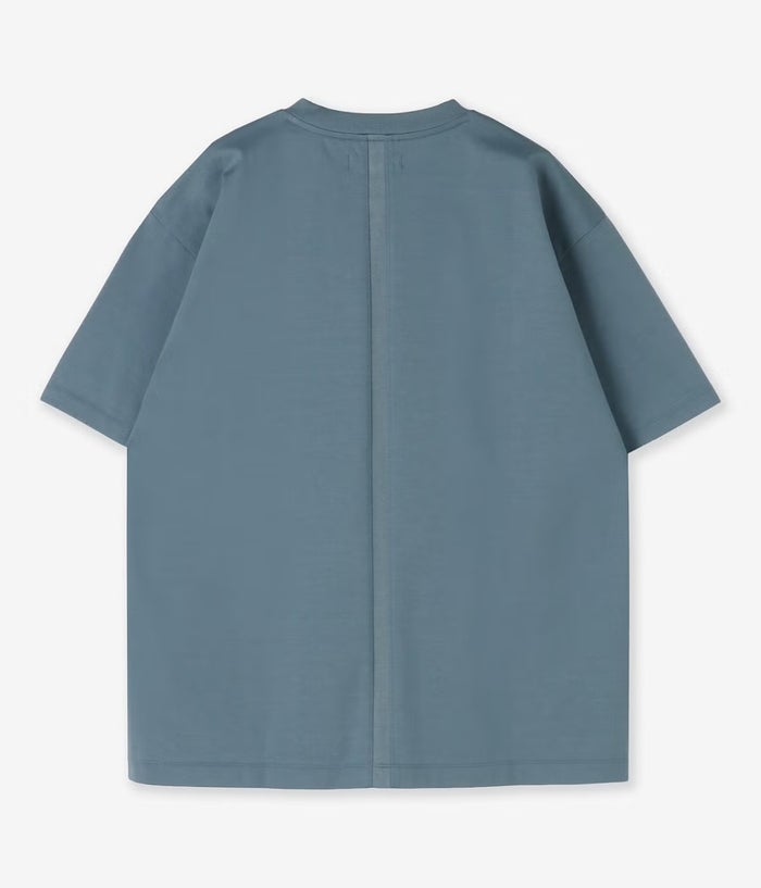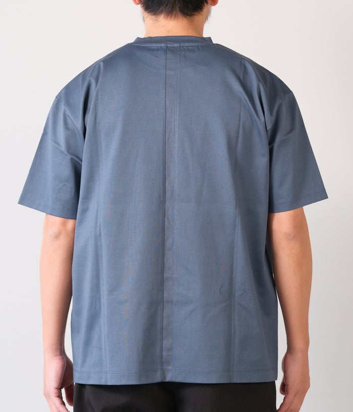 ややゆとりを持たせたサイズ感に加え、後袖部分にはフライス素材で切替を施し、動きやすさとさりげないアクセントをプラス。丸みを帯びたクルーネックが首元を優しく包み込み、リラックスした雰囲気の中にも品のある印象を演出します。ベーシックながら、シルエットで差をつける一着です。