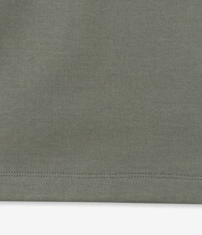 肉厚でハリのある天竺素材を採用。20~30番クラスのコンパクト糸を使用し、毛羽立ちを抑えながらもしっかりとした質感に仕上げています。さらにシルケット加工を施すことで、光沢感と清潔感のある表情を実現。100回洗濯してもヨレにくいタフさを誇ります。