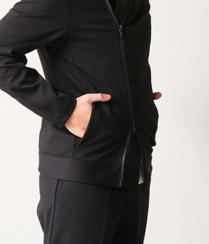 WRAP COATのフードデザインとセミライダースのディテールを掛け合わせ、無駄を削ぎ落としたミニマルなデザインに構築。身体に自然とフィットするよう計算されたスリムシルエットが、スタイリッシュで洗練された印象を演出します。