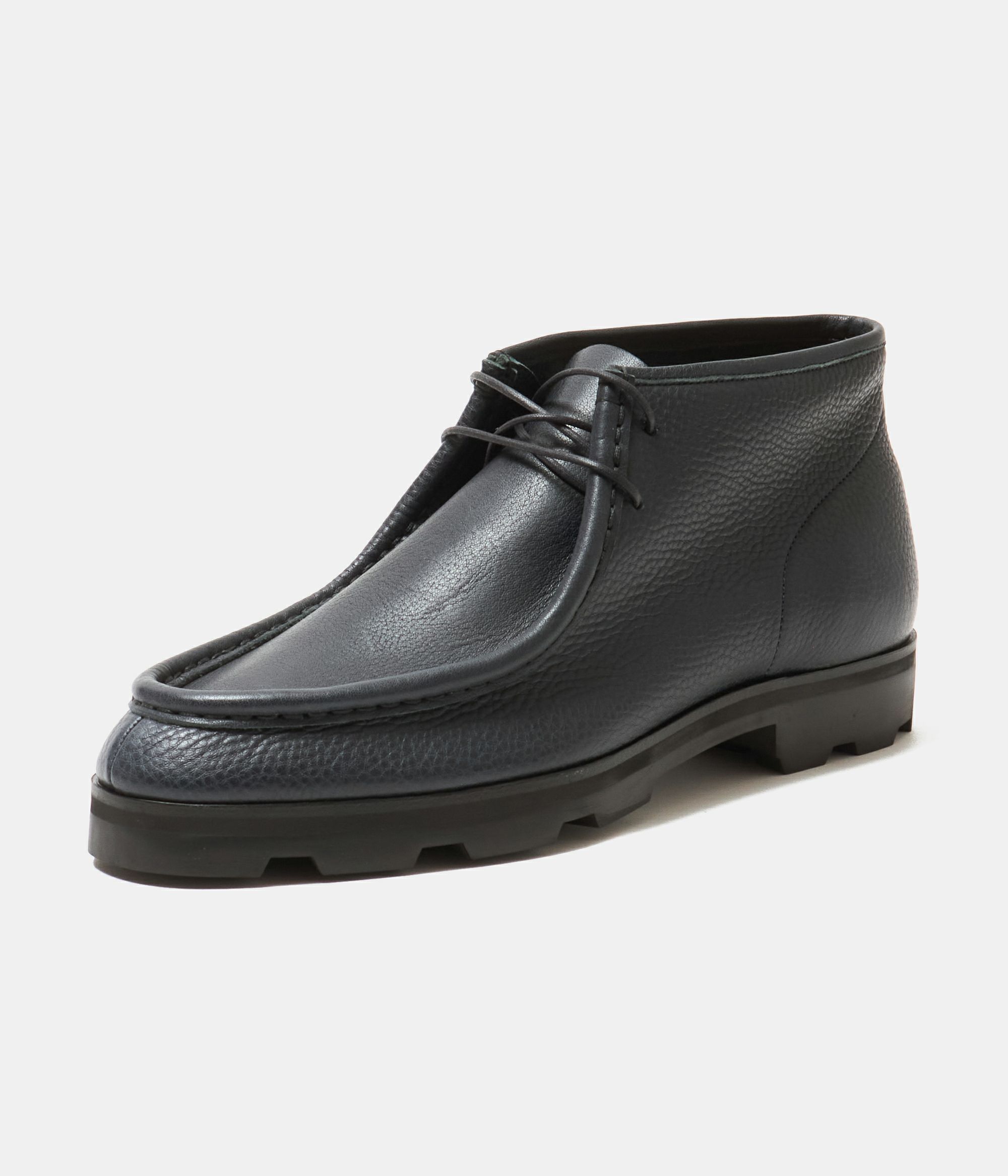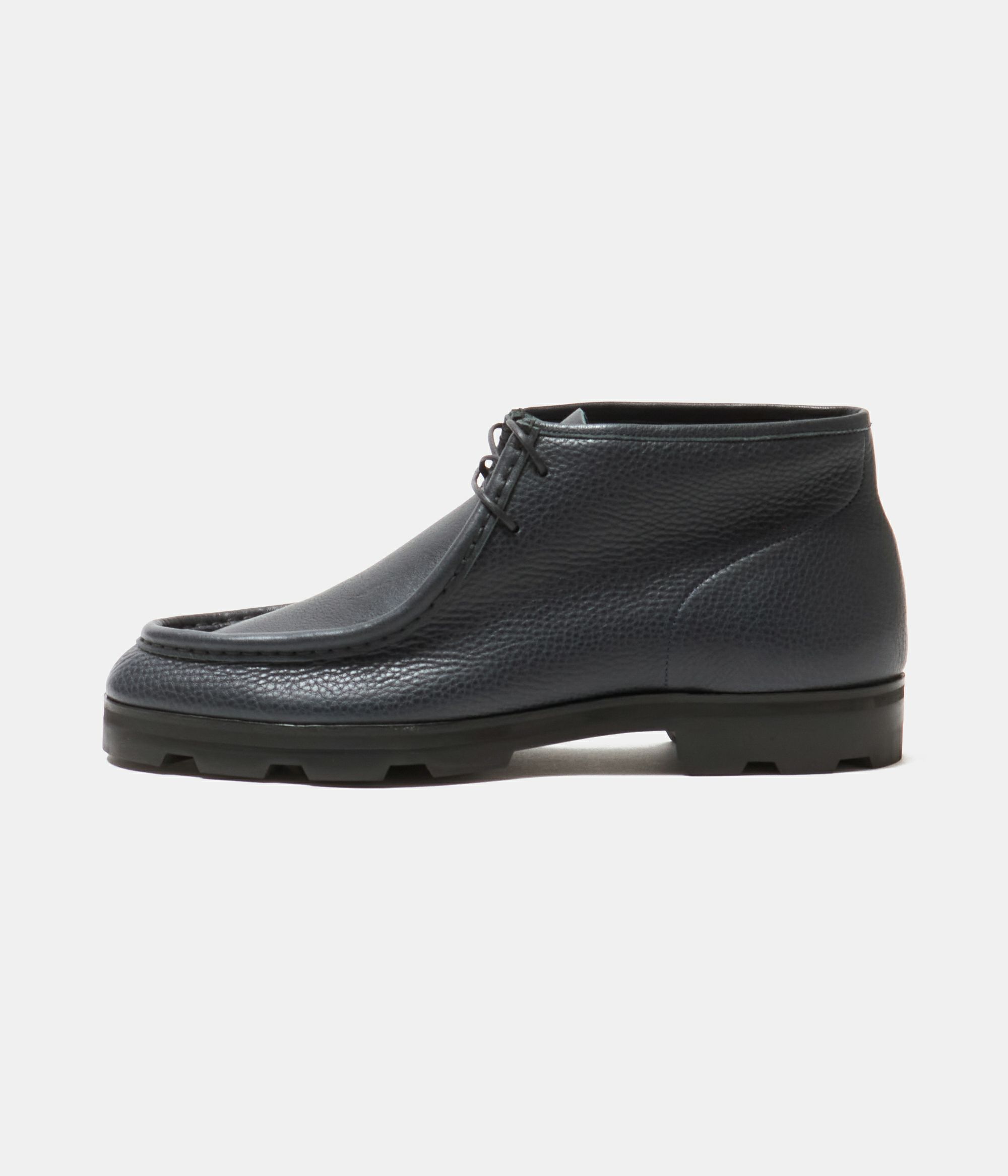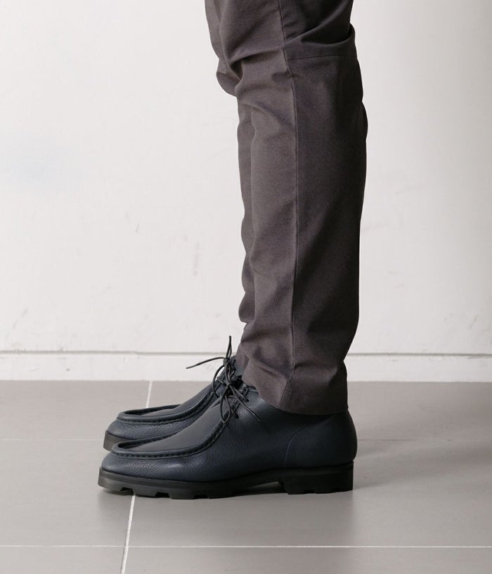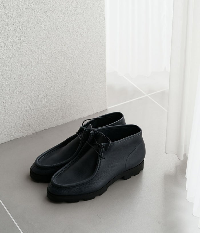 足を包み込むような立体的なモカシン製法により、履くほどに足に馴染む快適な履き心地を実現した別注モカシンブーツ。 特集ページはこちら 柔らかく返りの良い作りに加え、ハンドメイド感のあるU字ステッチが程よい存在感を演出し、カジュアルからきれいめまで幅広いスタイルに自然に溶け込みます。 ソールはVibramトレントソール。ラギッドなソールですが、セメント製法によりすっきりとした仕上がりに。EVA素材のミッドソールにより、適度にクッション性のある履き心地になっています。 ラスト(木型)はラウンドトゥの#808。指周りはゆったりと、後足部は甲を低くタイトに絞り込みました。近年日本人に多い華奢な足でもサイズダウンすることなく、適正レングスで履いていただけます。タイトさを重視するとカジュアルな雰囲気が損なわれがちですが、バランスよく両立したラストとなっています。甲周りが低くタイトな為、標準から甲高の方には1つ上のサイズを推奨しています。#808はUS表記なのでUK表記の#7965、#GINZAからするとサイズが1つ上がります。(例 UK7.5=US8.0) NAVYにはオイルをたっぷりと含ませた牛革のダブルオイルシュリンクレザーを使用。しっとりとした柔らかさと自然なシボ感が特徴で、履き始めから足馴染みが良く、経年変化も楽しめます。傷が目立ちにくく、デイリーユースに最適な上質レザーです。