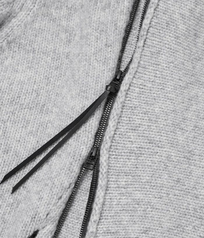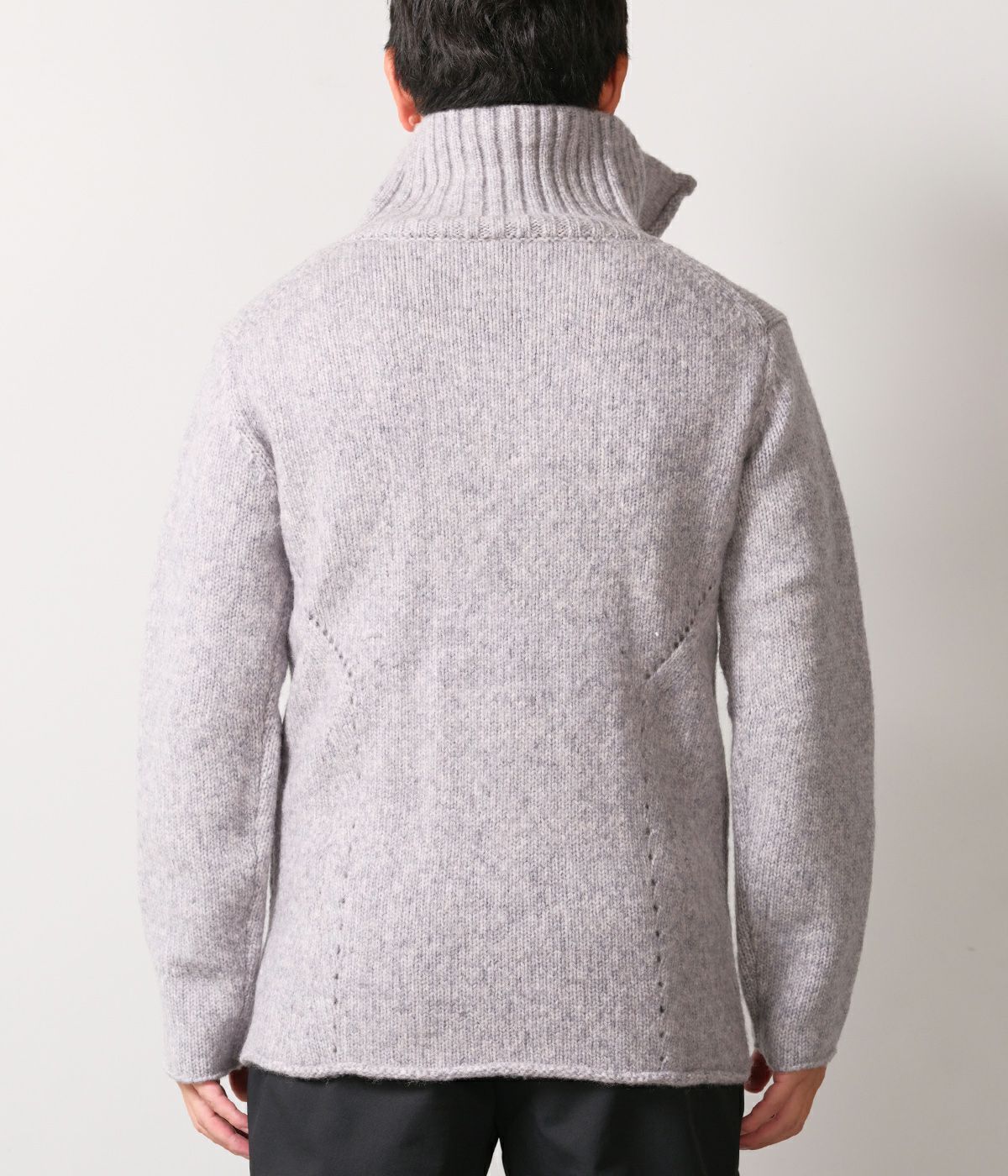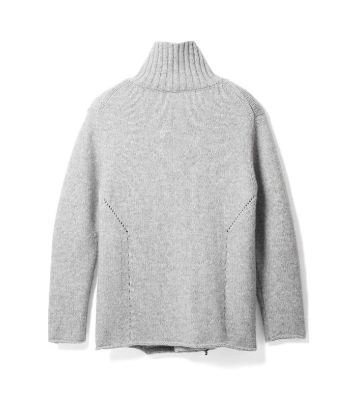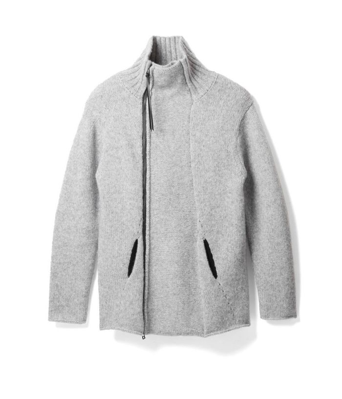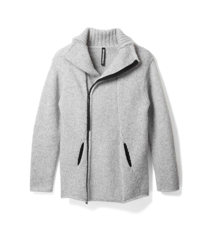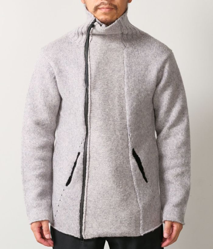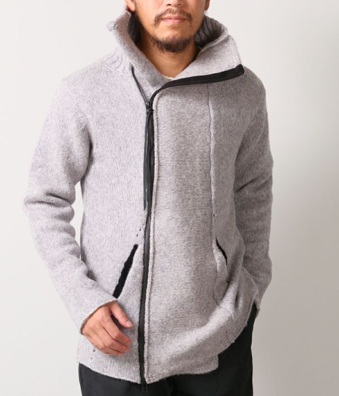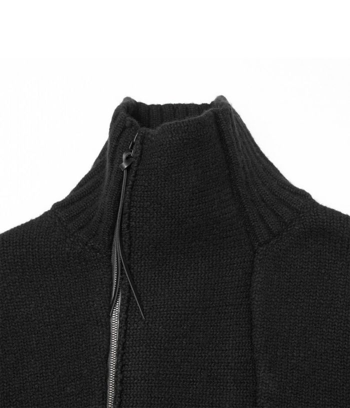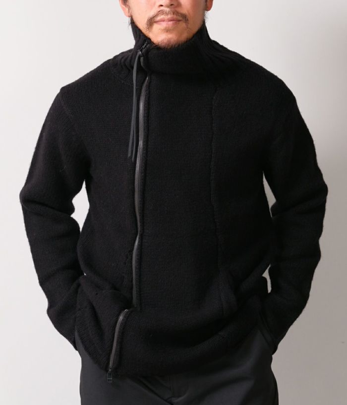 RIPがニットでライダースを提案したらというコンセプトで、布帛に劣らず完成度が高いアイテム。素材はウールナイロンの混紡糸で、膨らみと嵩高さがある3GGの天竺編。前身と後身にアクセントとなるアイレット編み、スライダートップに装着した革紐もポイントです。