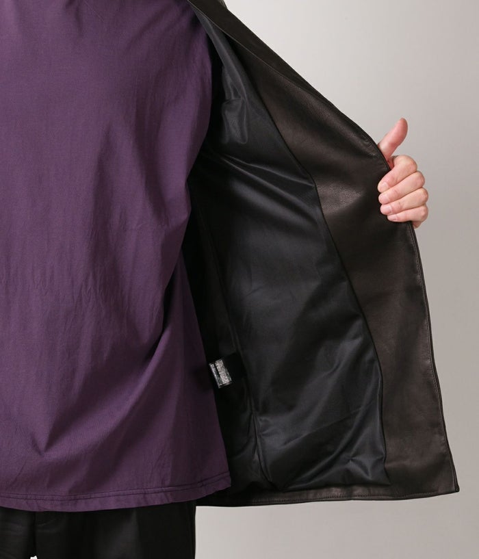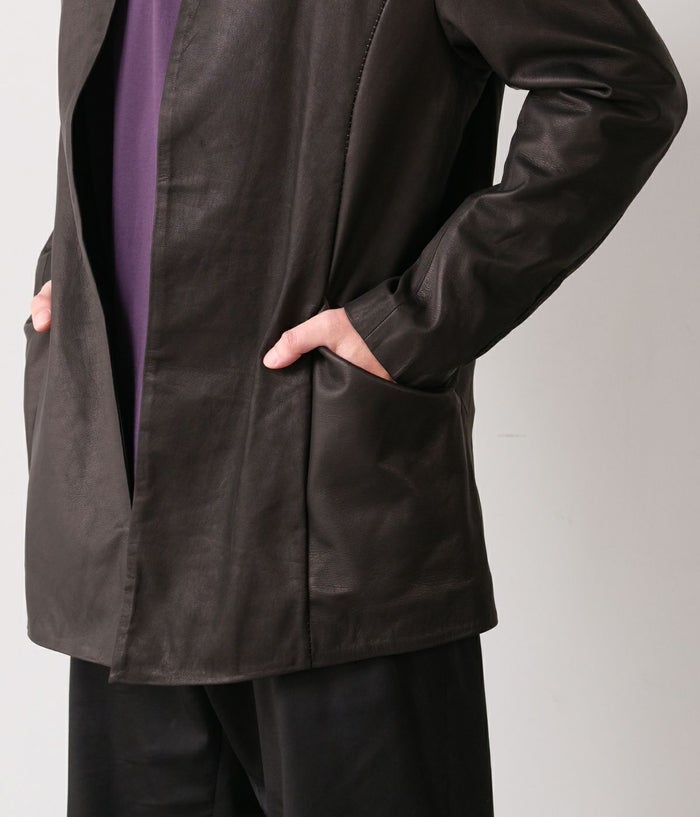 国内の牛原皮を使用し、ソフト鞣しの後、仕上げは顔料を一切使わずに染料のみで染革したRIPオリジナルレザー。とにかく馴染みやすい革で、着用する度に程良い微光沢が生まれるのも人気の特徴。ネック裏からアームに沿ってのステッチもワンポイントで◎