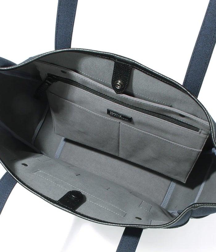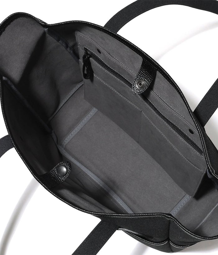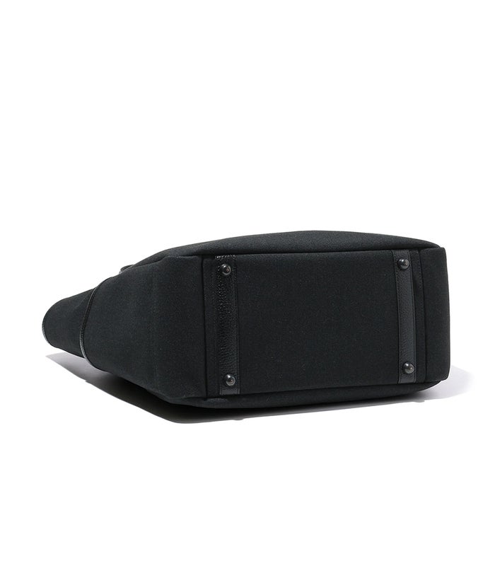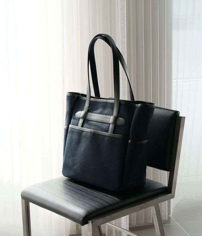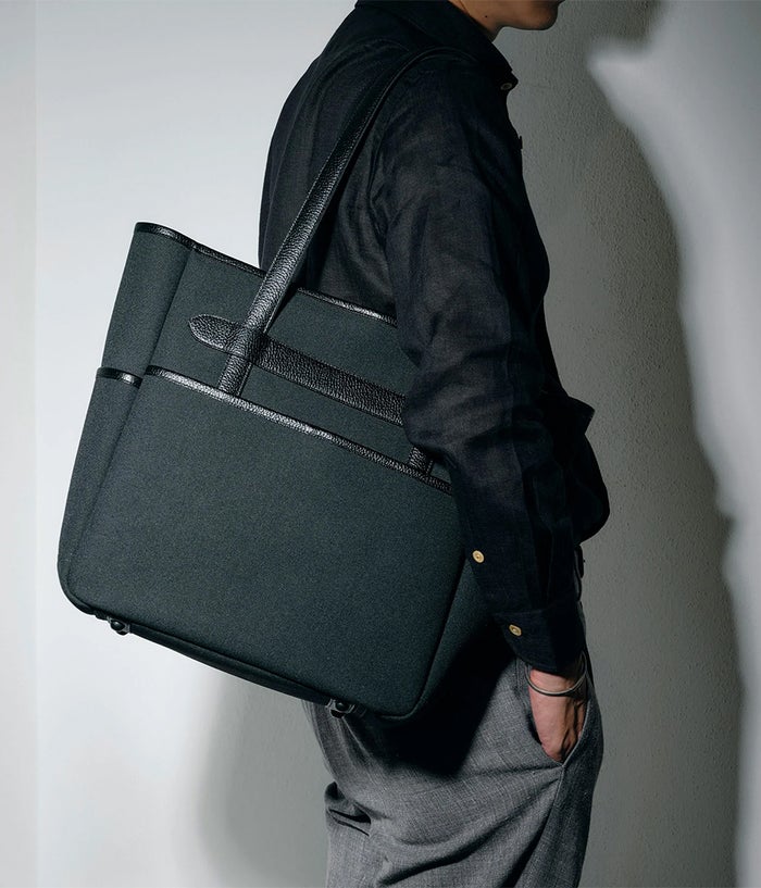 表面のキャンバスをハンドルの裏側に用いたり、ライニングには人工スエードを用いて芯材のようにボンディングし、限りなく副資材を省くことで、驚くほどの軽量さを実現しました。 素材表面の「撥水性」と「堅牢性」、そこに軽さが加わった現代的で実用性の高いバッグに仕上がっています。