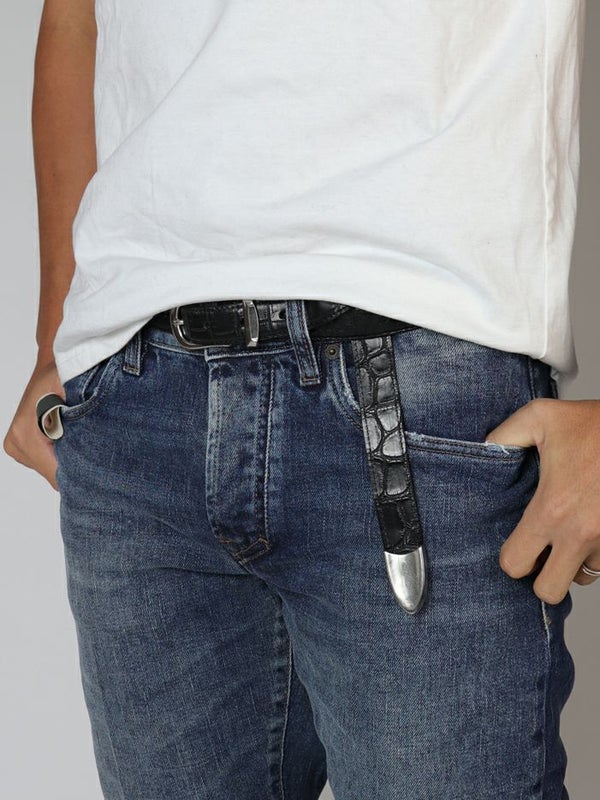 締める箇所と垂れる部分をそれぞれ別の厚みと柔らかさに仕上げており、着用時の全体のバランスを考えられたデザインです。 このベルトを使用するだけでスタイリングがシャープに締まり、やり過ぎない適度な個性も演出してくれます。 デニムなどのカジュアルから、スーツやドレススタイルの着崩しまで幅広く、長く愛用できる素晴らしいベルトです。