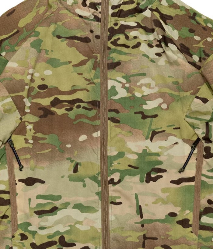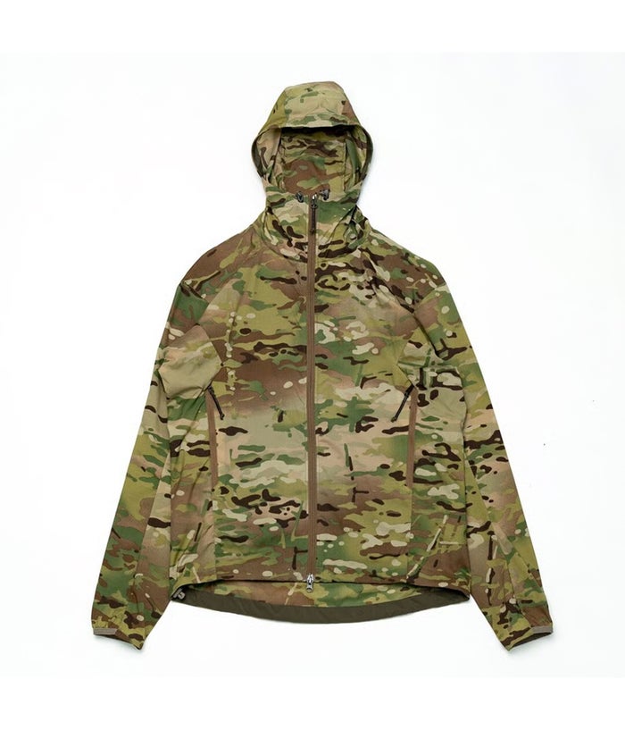 このマルチカモで使用している素材はUSメイドの撥水透湿性あるリップストップナイロン。薄いが、かなり強度性と撥水力が高い。触ると、一瞬「ハードシェル?」と思うようなハリ感。よくある、薄くて頼りない生地とは別格に違う、ハイクラスの薄手撥水シェルだ。
