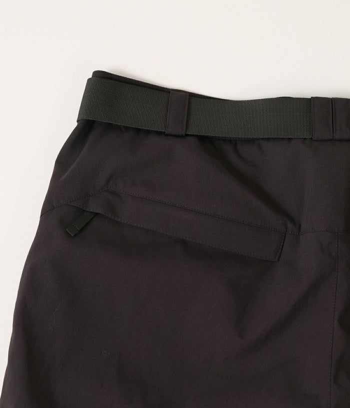 ポケットはフロントに2つとサイドジッパーポケットが一つ。背面に2つのジッパーポケット、ベルト一体型。