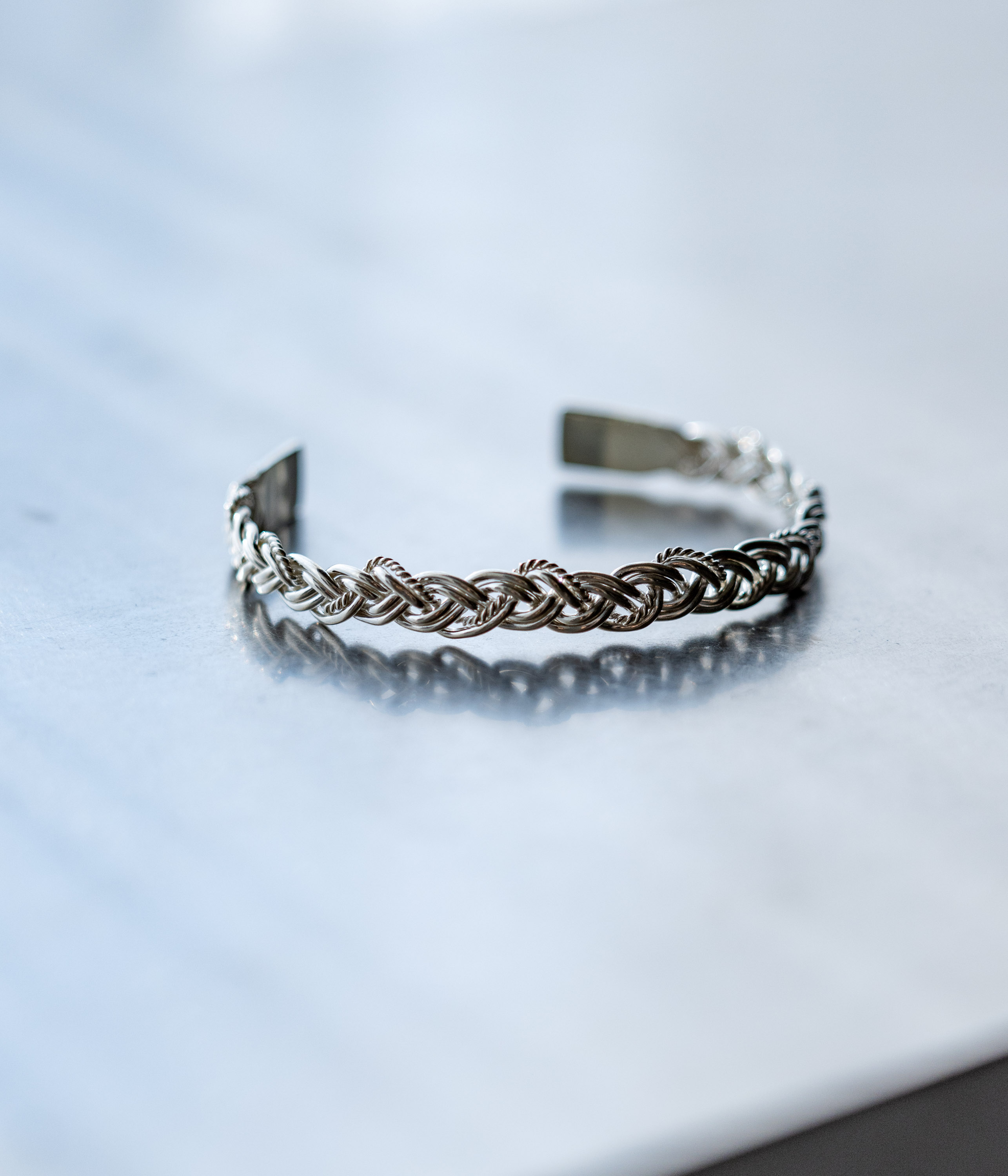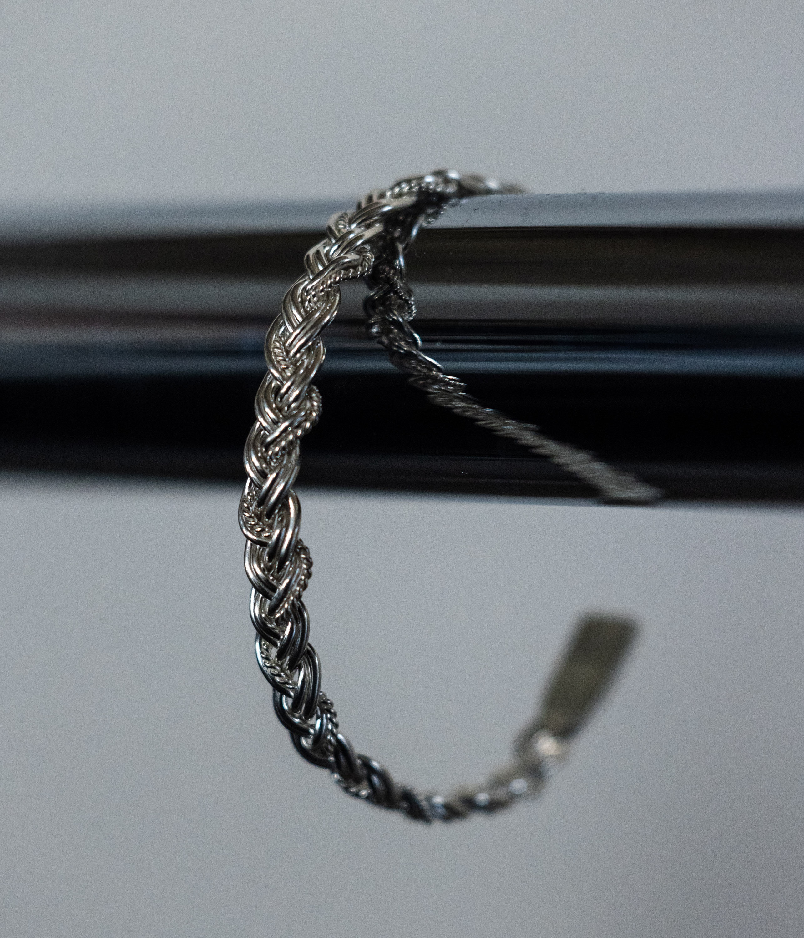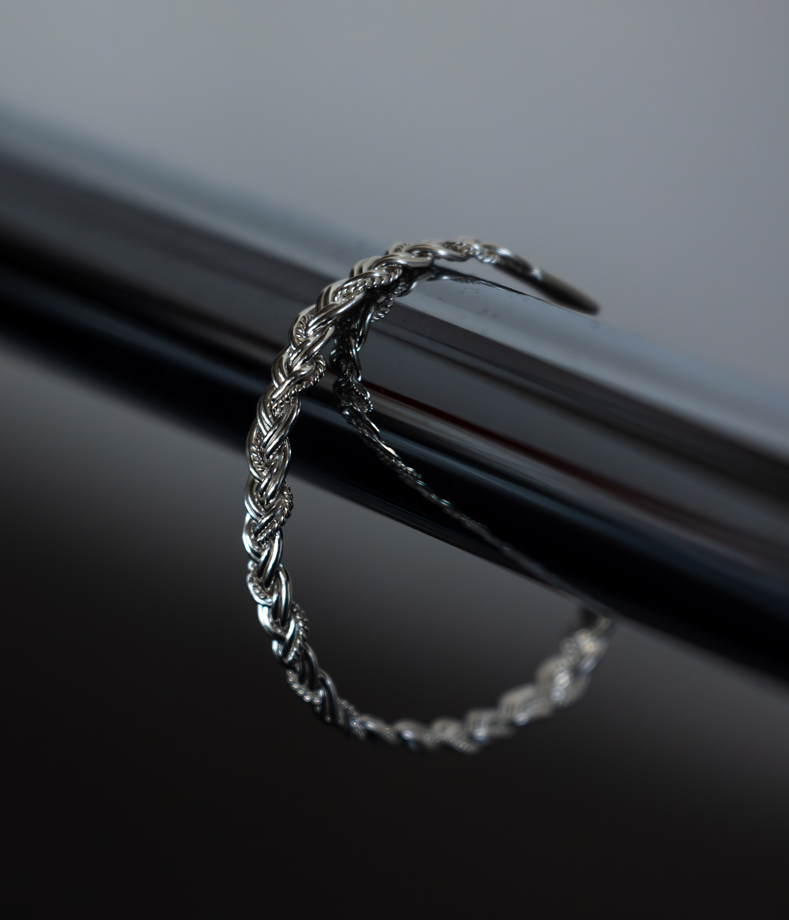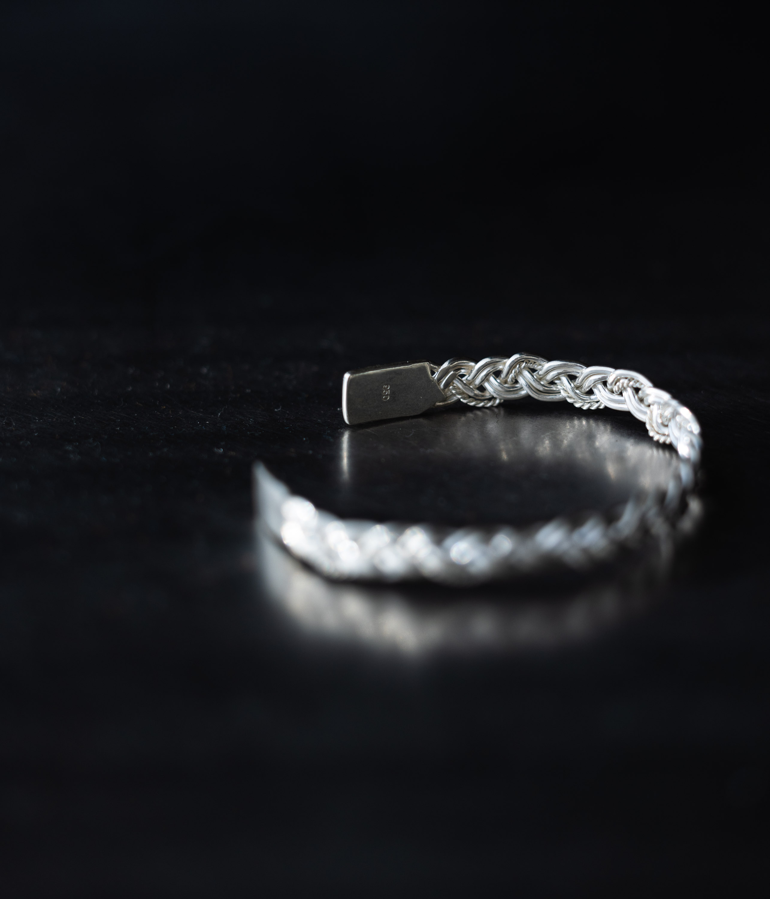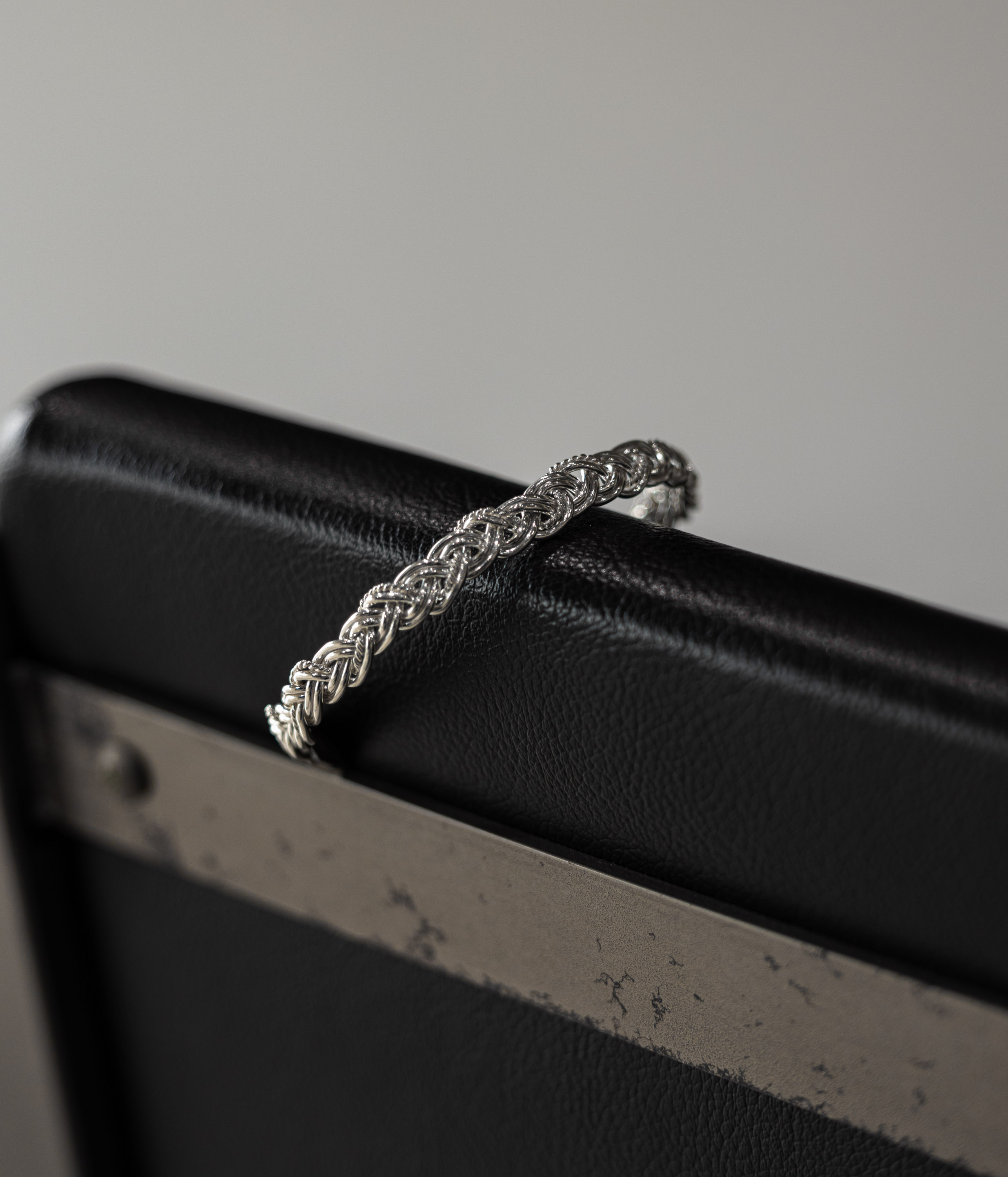 1本のプレートから6本の線を抽出し、そのうちの2本だけ1本に捻りながら編み込むこだわりのデザイン。