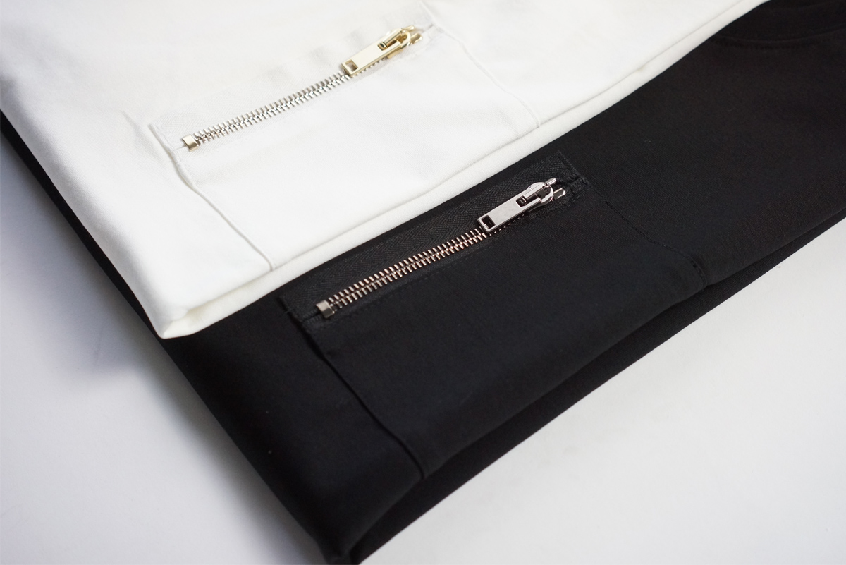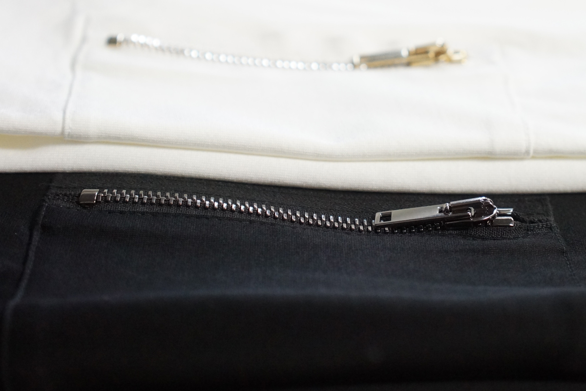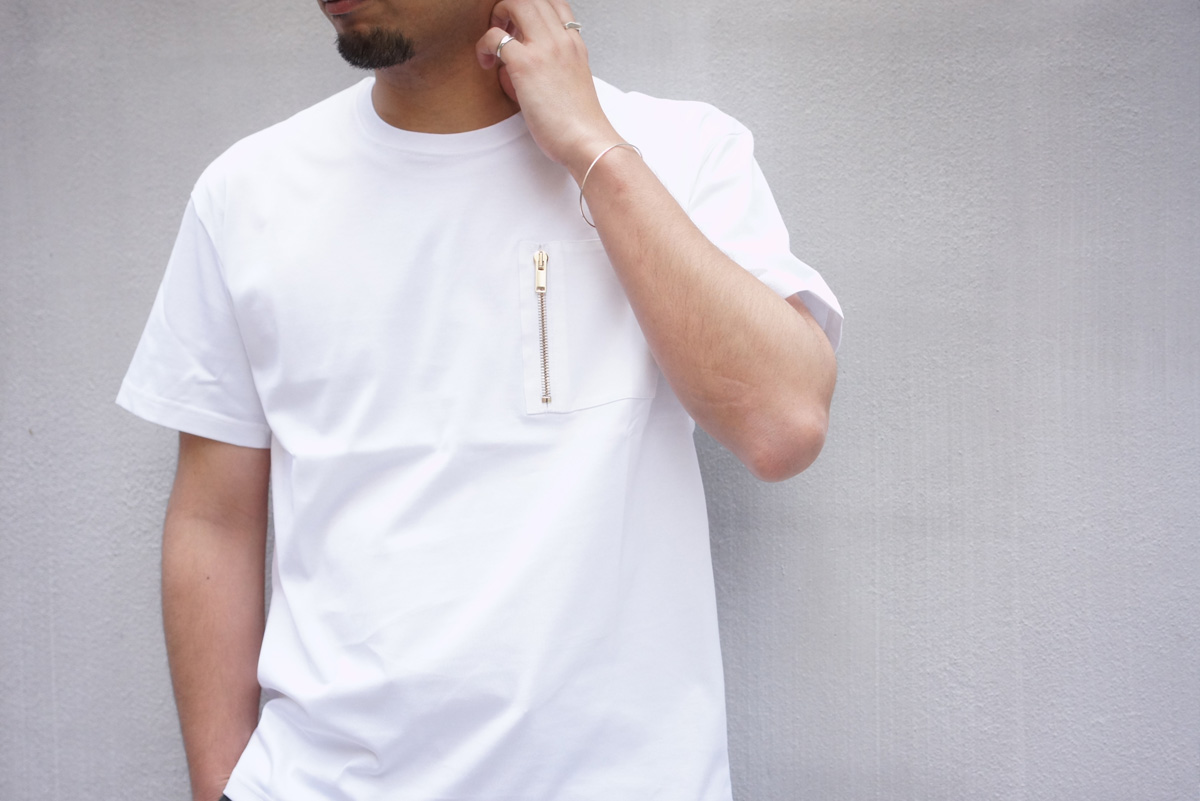 - 通称ポケTの一般的なデザインは横にポケット口があり、そこにモノを収納。ならばポケット口をジップで開閉するデザインで!と閃きましたが、大きな落とし穴。まず、ラッカーニジップって素材の性質上『重いですよね?』横にジップを装飾した際に考えらることはその重さにTシャツの生地が負けて、 ポケット口が緩くなり下へだら〜んと生地が落ちてしまうイメージが先行。デザインとしては『アリ』なのかもしれませんが、 理想のポケットTとは違うなぁ…と再考し、浮かんだ解決策、