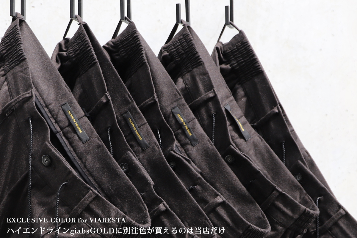 - モデルはgiabsARCHIVIO定番のマサッチョ。ウエスト部分のサイドギャザーや外側にも内側にも仕舞えるドローコード、アイロンによるプレスではなく、つまみステッチによる永久クリース仕様など楽チンな履き心地と足のラインをきれいに魅せる美脚効果が期待できるモデルです。