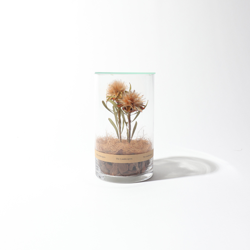 シンプルな筒状のガラスに個性的で、シンボリックなドライフラワーを美しく配置されたオブジェ。植物の最も美しい瞬間がドライフラワーの状態で保存されており まるで時が止まったような『詩的』な魅力が上手く表現されています。国内のガラス工場で1枚1枚製作されているガラス蓋は 透明度も高く中身の美しさを損なうことはありません。