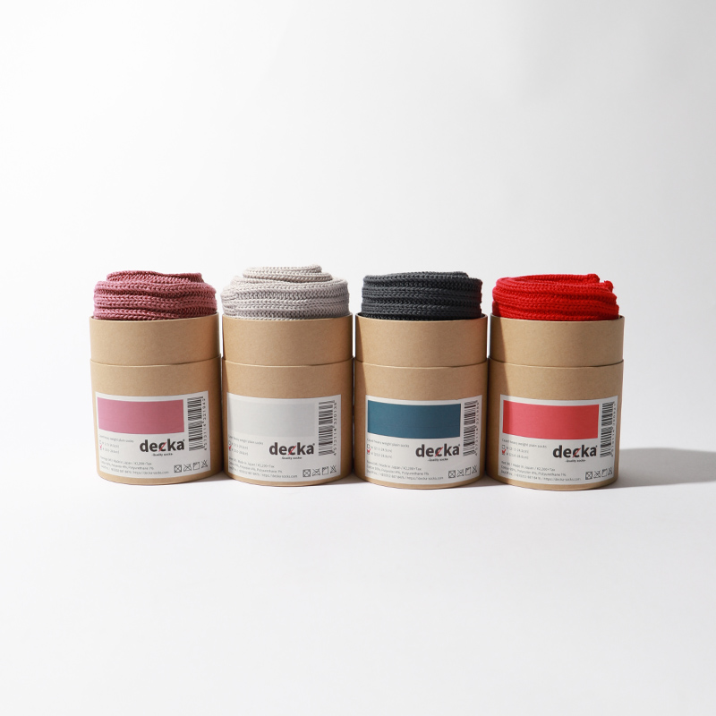 一般的なリブソックス約5足分の糸を使用し、旧式の機械で編み立てた。丈夫さはもちろんの事、見た目からは感じられない締付の少ない優しい履き心地をしている。 ブーツ、スニーカー、サンダルとも合わせやすいデカクォリティソックスのアイコン的な靴下。