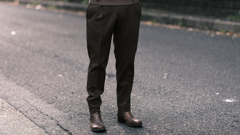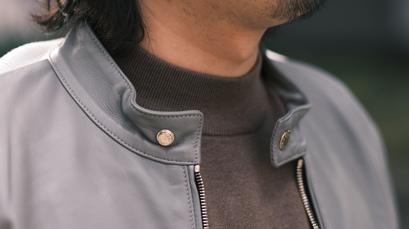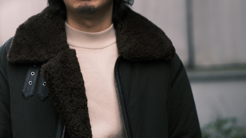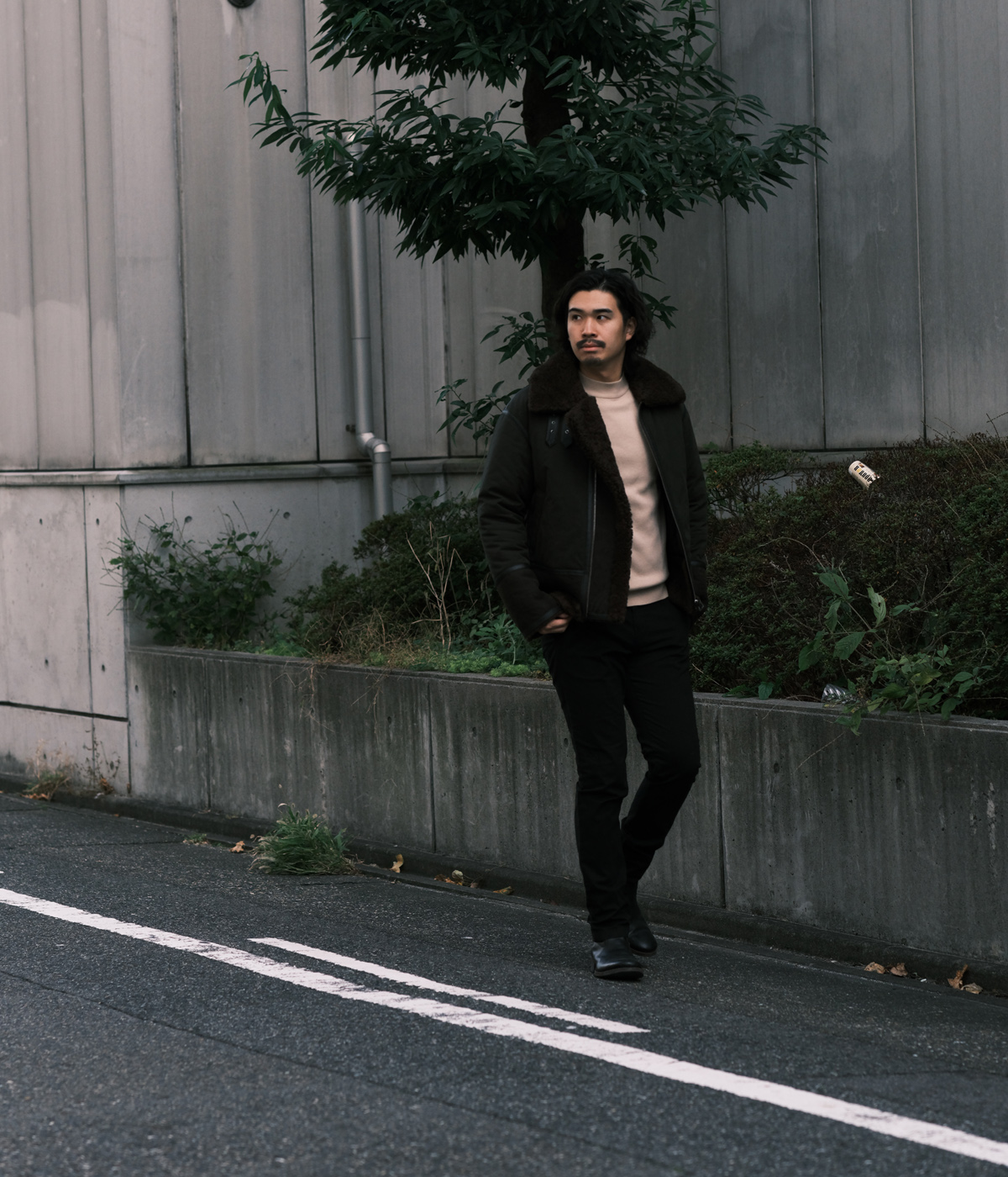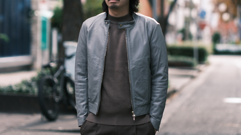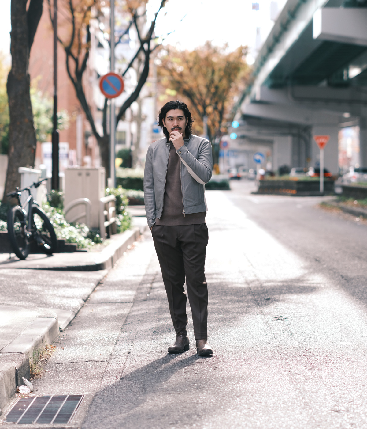 アイテムごとにニュアンスの近いカラーですが、微妙に違う色合わせでグラデーションになっているのがポイントです。適度に厚みのあるモックネックカットソーにはやっぱりライダースジャケットは高相性です。実は背面がニット仕様になっているライダースにだらしなく見えないバランスで適度にゆとりがあるシルエットのウールスラックスと見た目以上に着心地の良いアイテム選びをしたところも拘りです。