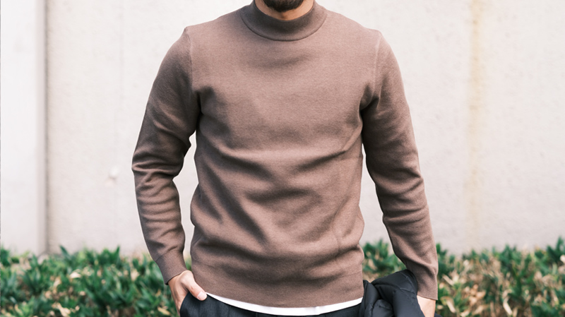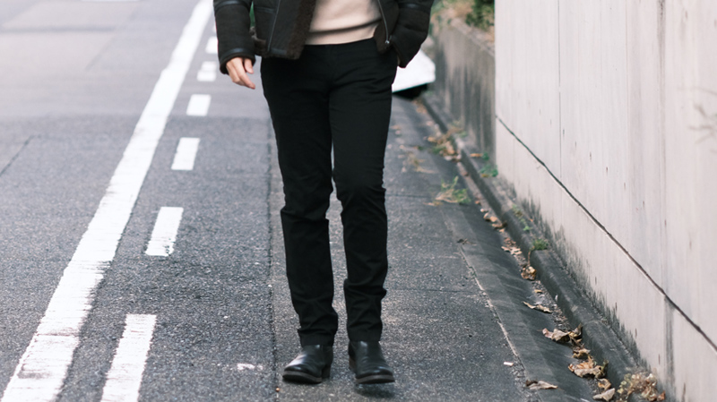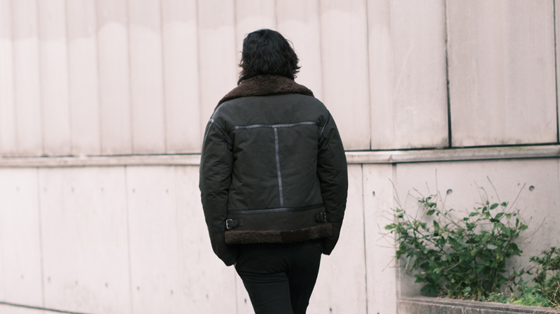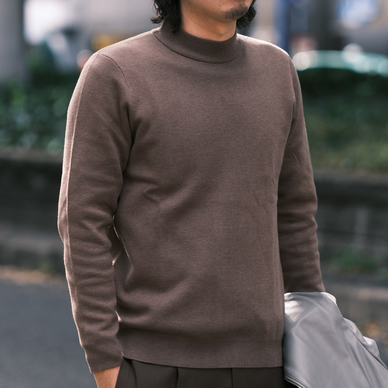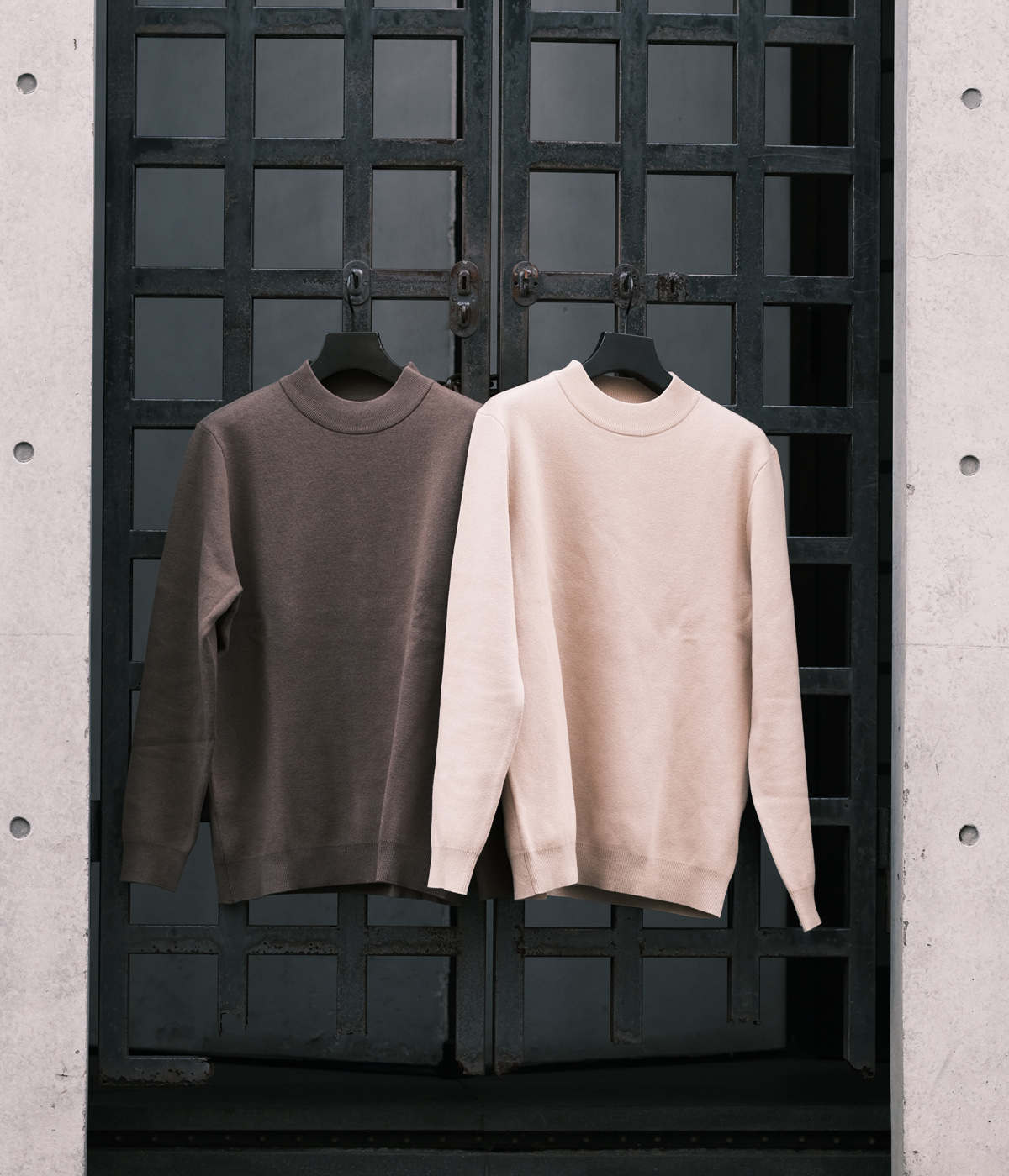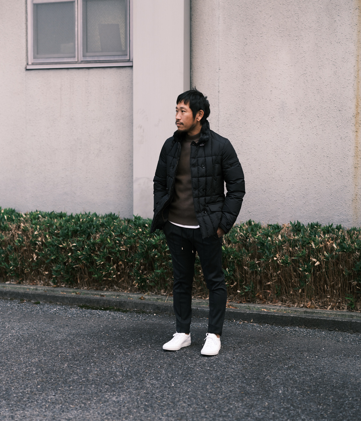 アイテムごとにニュアンスの近いカラーですが、微妙に違う色合わせでグラデーションになっているのがポイントです。適度に厚みのあるモックネックカットソーにはやっぱりライダースジャケットは高相性です。実は背面がニット仕様になっているライダースにだらしなく見えないバランスで適度にゆとりがあるシルエットのウールスラックスと見た目以上に着心地の良いアイテム選びをしたところも拘りです。