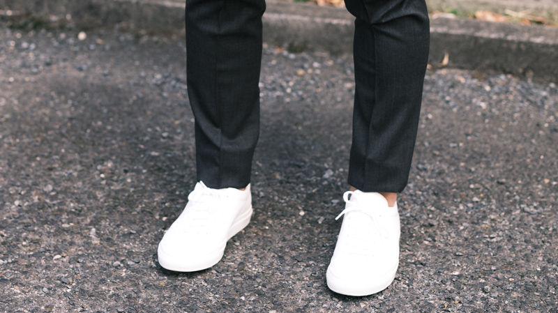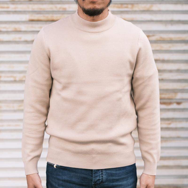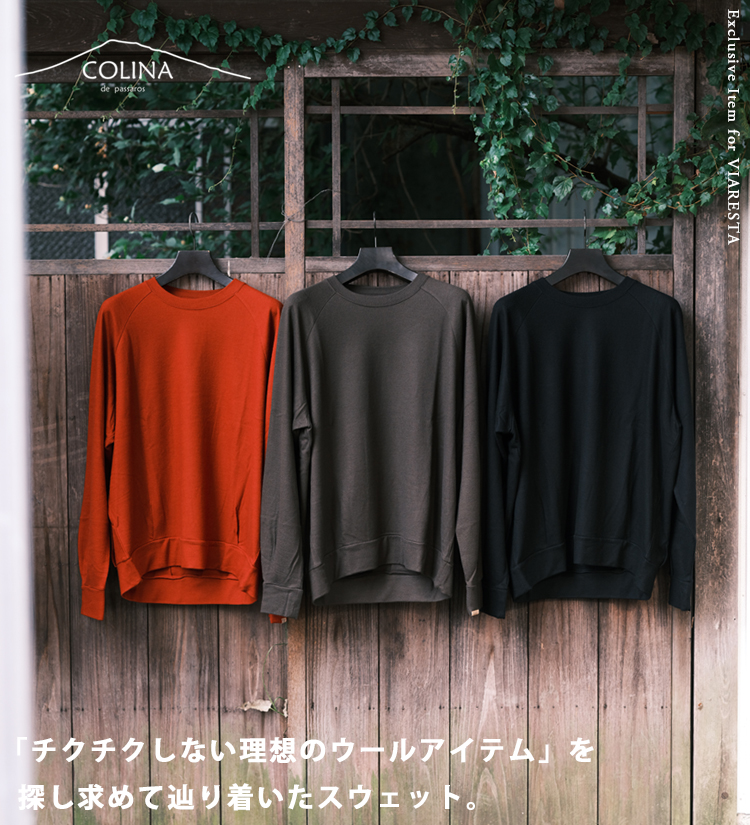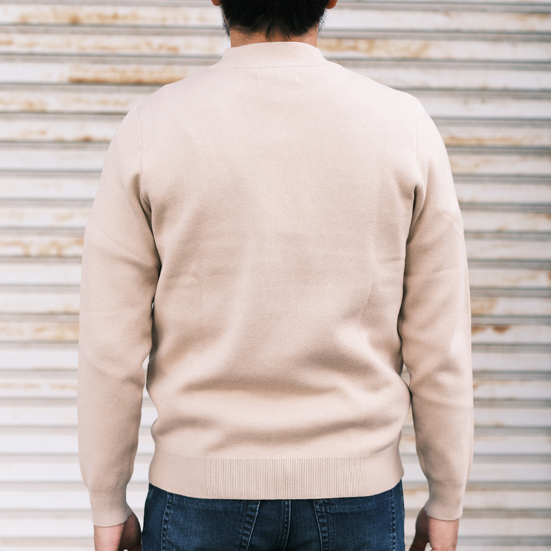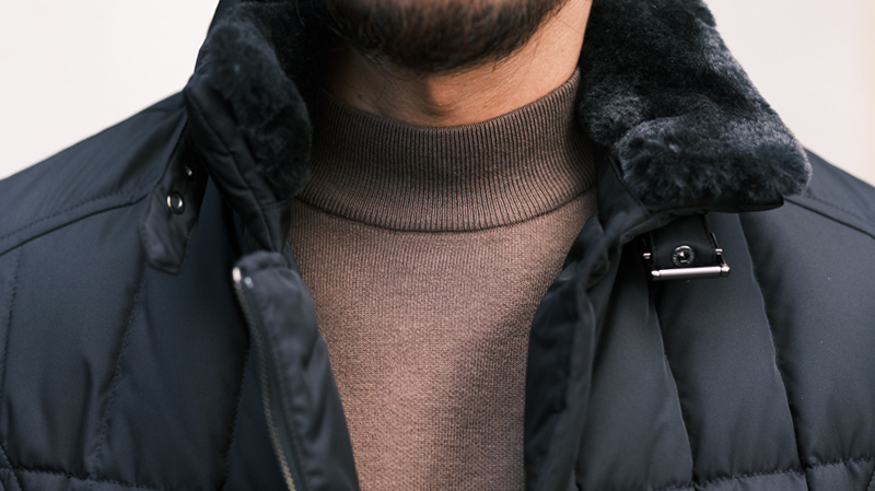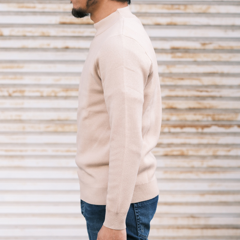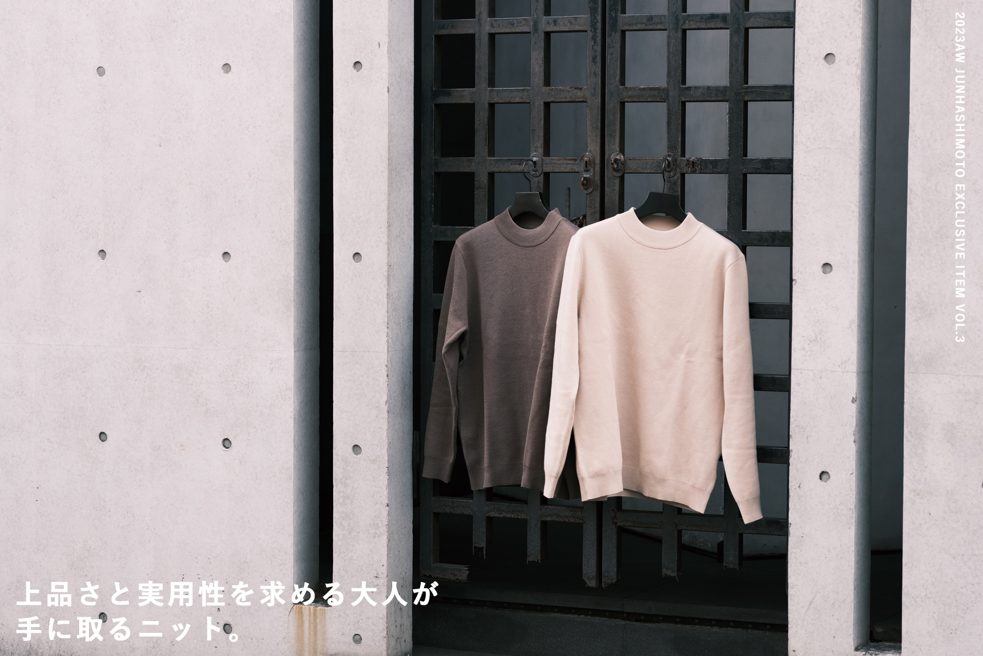 アイテムごとにニュアンスの近いカラーですが、微妙に違う色合わせでグラデーションになっているのがポイントです。適度に厚みのあるモックネックカットソーにはやっぱりライダースジャケットは高相性です。実は背面がニット仕様になっているライダースにだらしなく見えないバランスで適度にゆとりがあるシルエットのウールスラックスと見た目以上に着心地の良いアイテム選びをしたところも拘りです。