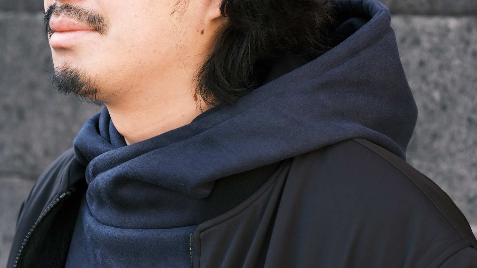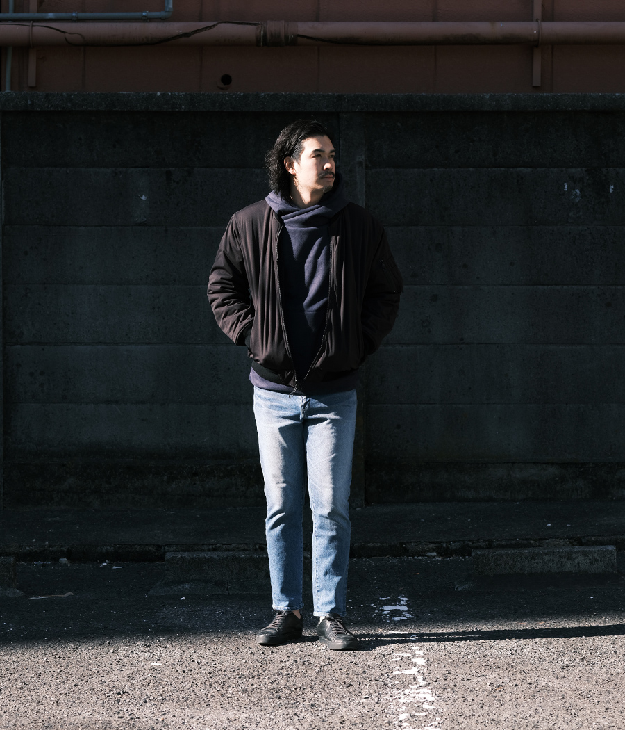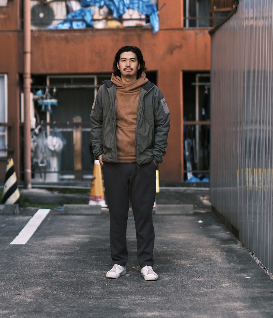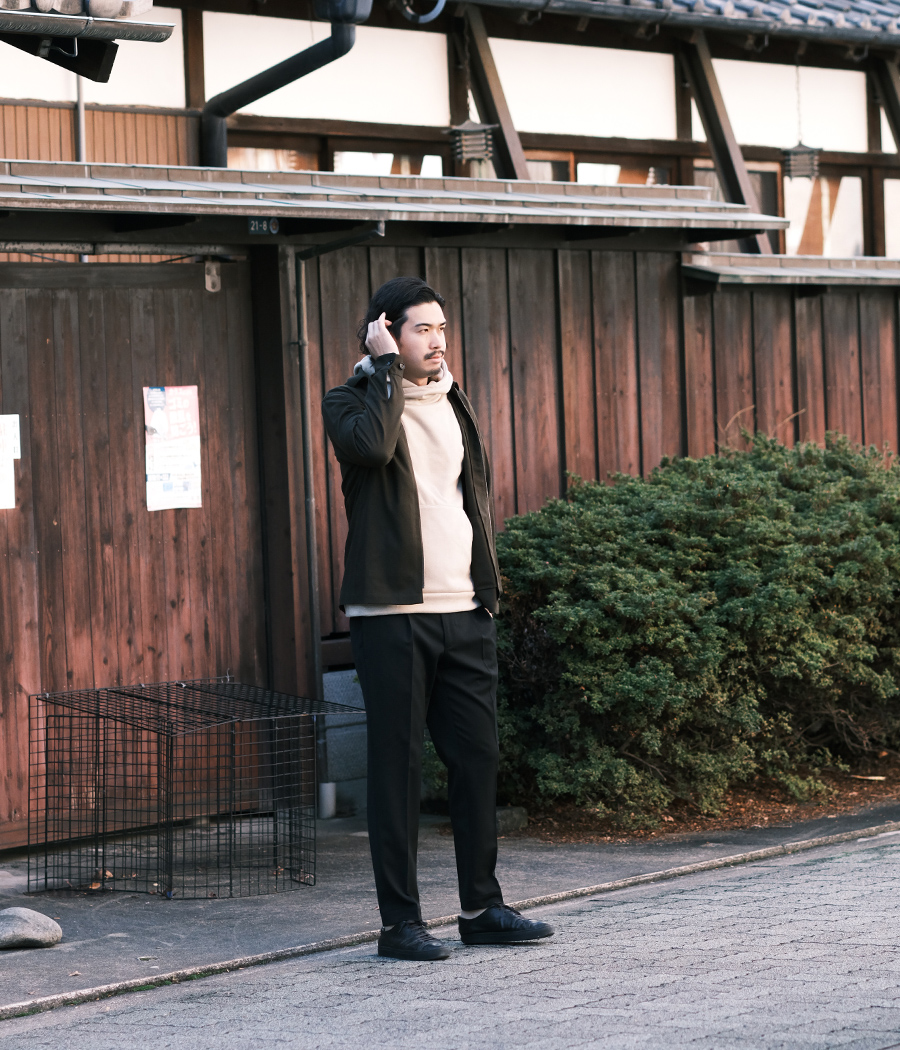 やっぱりパーカーにはデニムを履いて、こういったナイロン系のアウターを羽織るのは鉄板ですね。