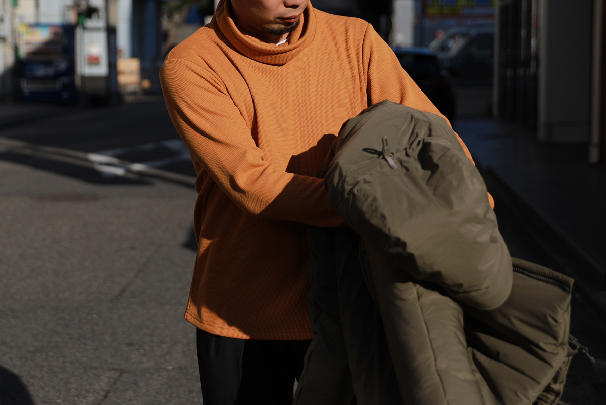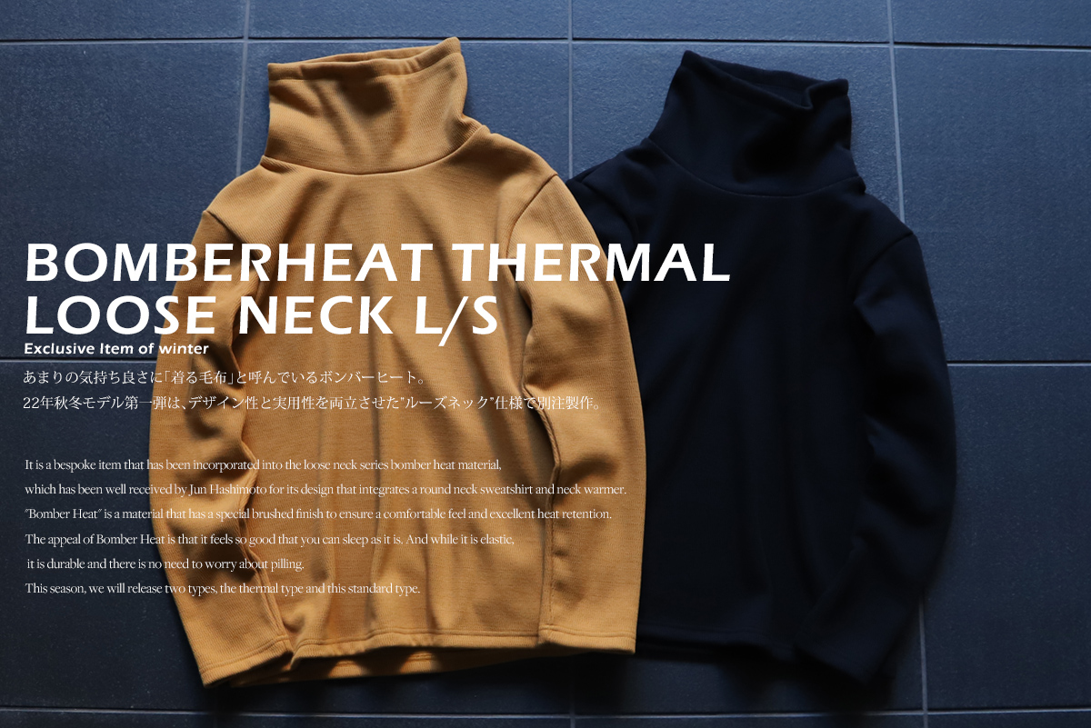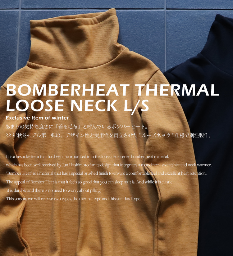- 気が付けば毎年リリースさせて頂いており、冬の風物詩になりつつあるボンバーヒートシリーズ。好きなモノはとことん好きな性分が若干前のめりな気がしますが、今年もボンバーヒートの魅力を皆様と存分に共有したいと思い、 「ルーズネック」「モックネック」「クルーネック※12月発売予定」「タックパンツ※12月発売予定」の4型をリリースさせて頂きます。