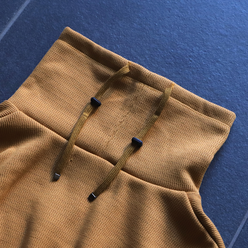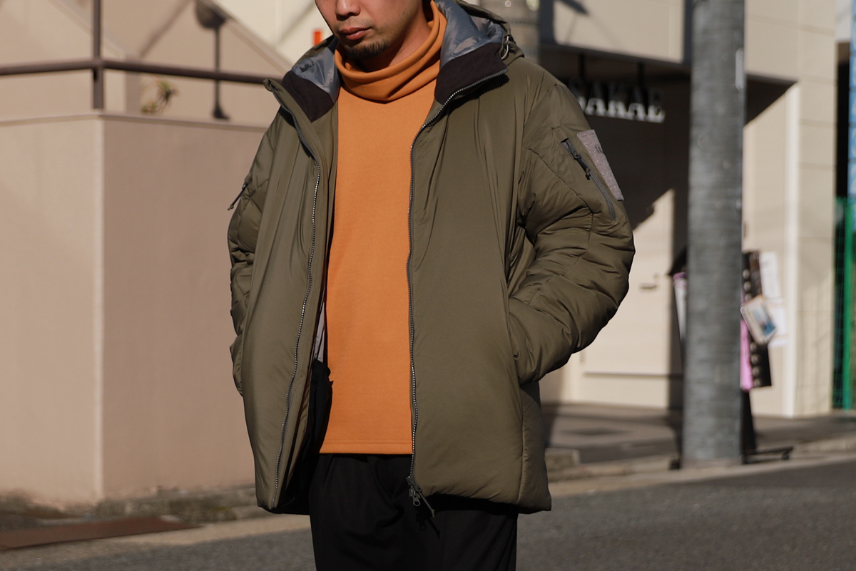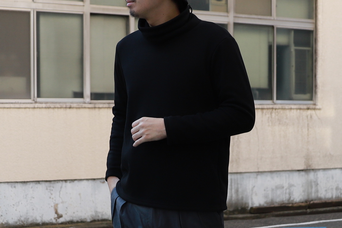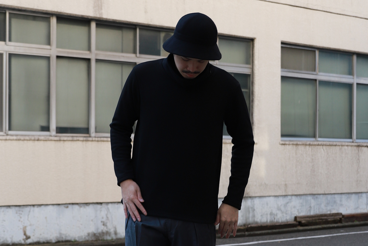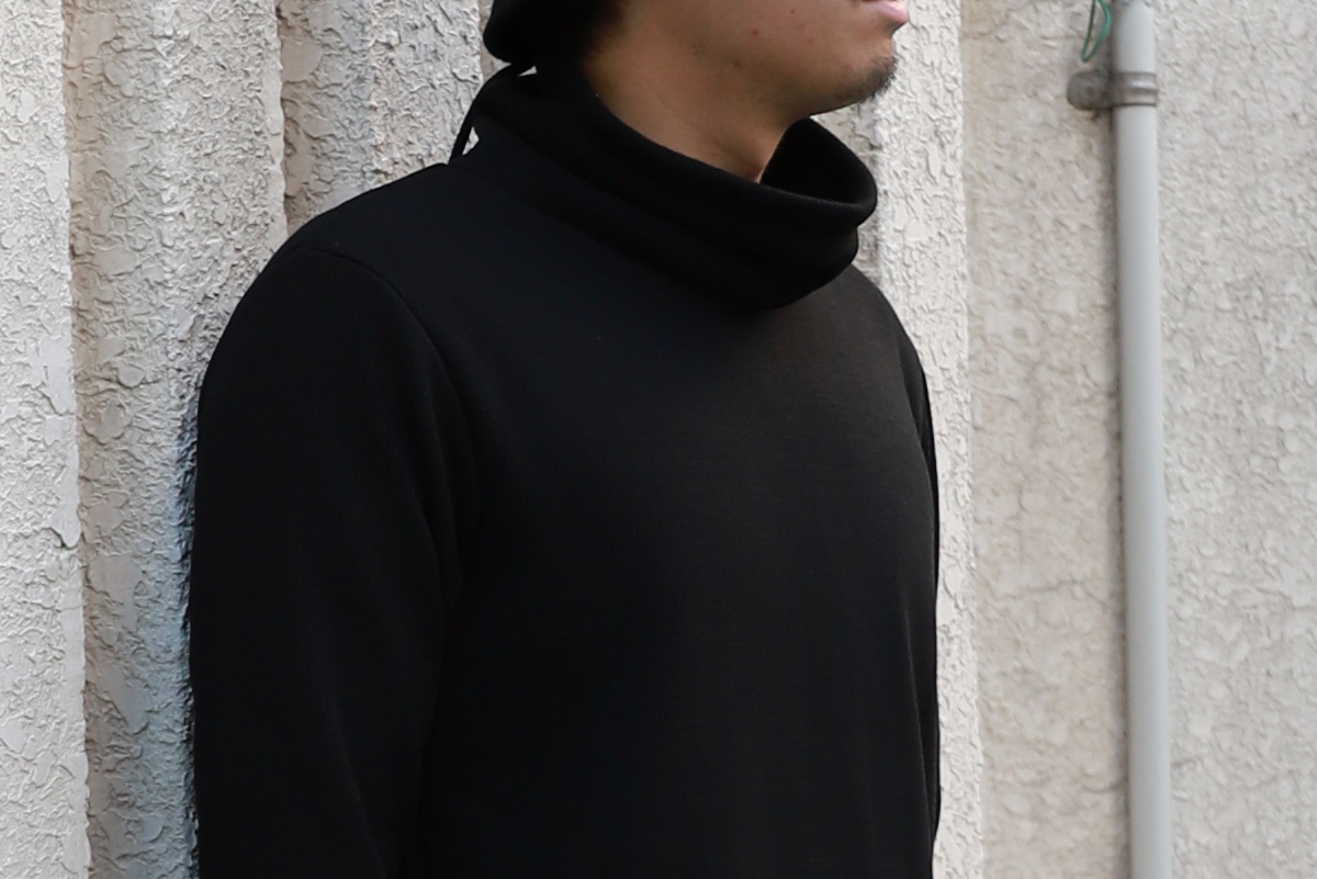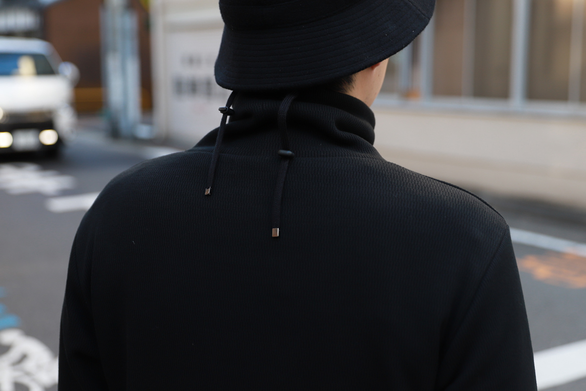 - 肝心の第一弾は、サーマルタイプを、昨今ジュンハシモトで評判の良いルーズネックデザインに落とし込みました。 ネック部分を上まで上げ後ろのドローコード引くと簡易的なマスクとしても利用可能。 昨今の情勢ならではのディティールですが、丸首トレーナーとネックウォーマーを一体化させたようなデザインと思うと、とても理にかなったデザインです。