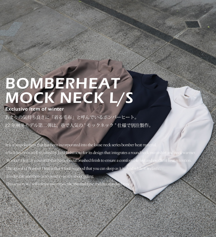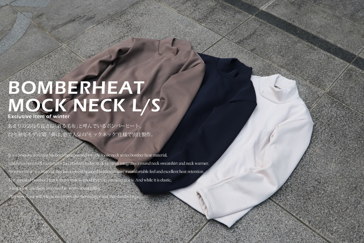 - 気が付けば毎年リリースさせて頂いており、冬の風物詩になりつつあるボンバーヒートシリーズ。好きなモノはとことん好きな性分が若干前のめりな気がしますが、今年もボンバーヒートの魅力を皆様と存分に共有したいと思い、 「ルーズネック」「モックネック」「クルーネック※12月発売予定」「タックパンツ※12月発売予定」の4型をリリースさせて頂きます。