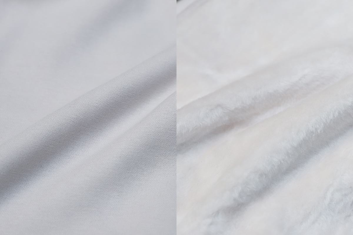 - フワフワのシャギーフリースを肌に触れる裏面・全面に敷き詰めた着心地は、もはや優しさの塊。 「柔らかく、心地良く。暖かく。」の3拍子揃った素材です。画像だと”いつもの”素材に見えますが、実は今回より、表面に使われている素材を綿から超長綿に変更いました。これによってより上質で滑らかな表情になりました。