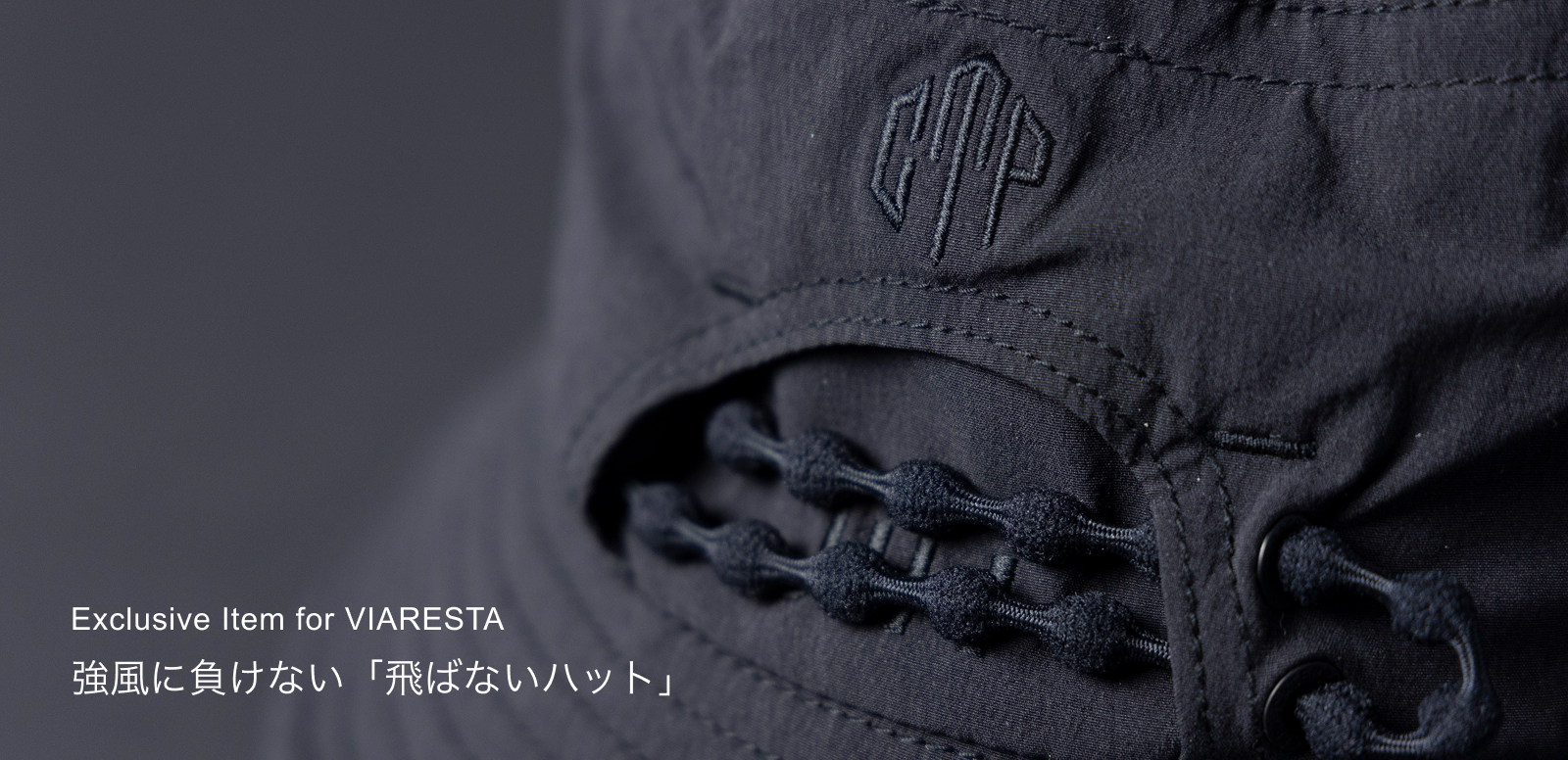 強風に負けない「飛ばないハット」名古屋店限定販売。マットな撥水ストレッチナイロンを採用し、アクティブなシーンでも安心して被って頂けます。