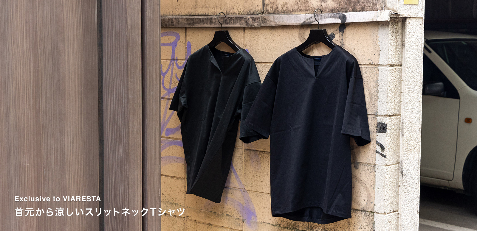 首元から涼しげな「スリットネックTシャツ」を当店限定で製作いたしました。2年前に即完売したスリットTを改良し、夏の定番ワイドパンツやショーツと合うバランスに仕上げました。