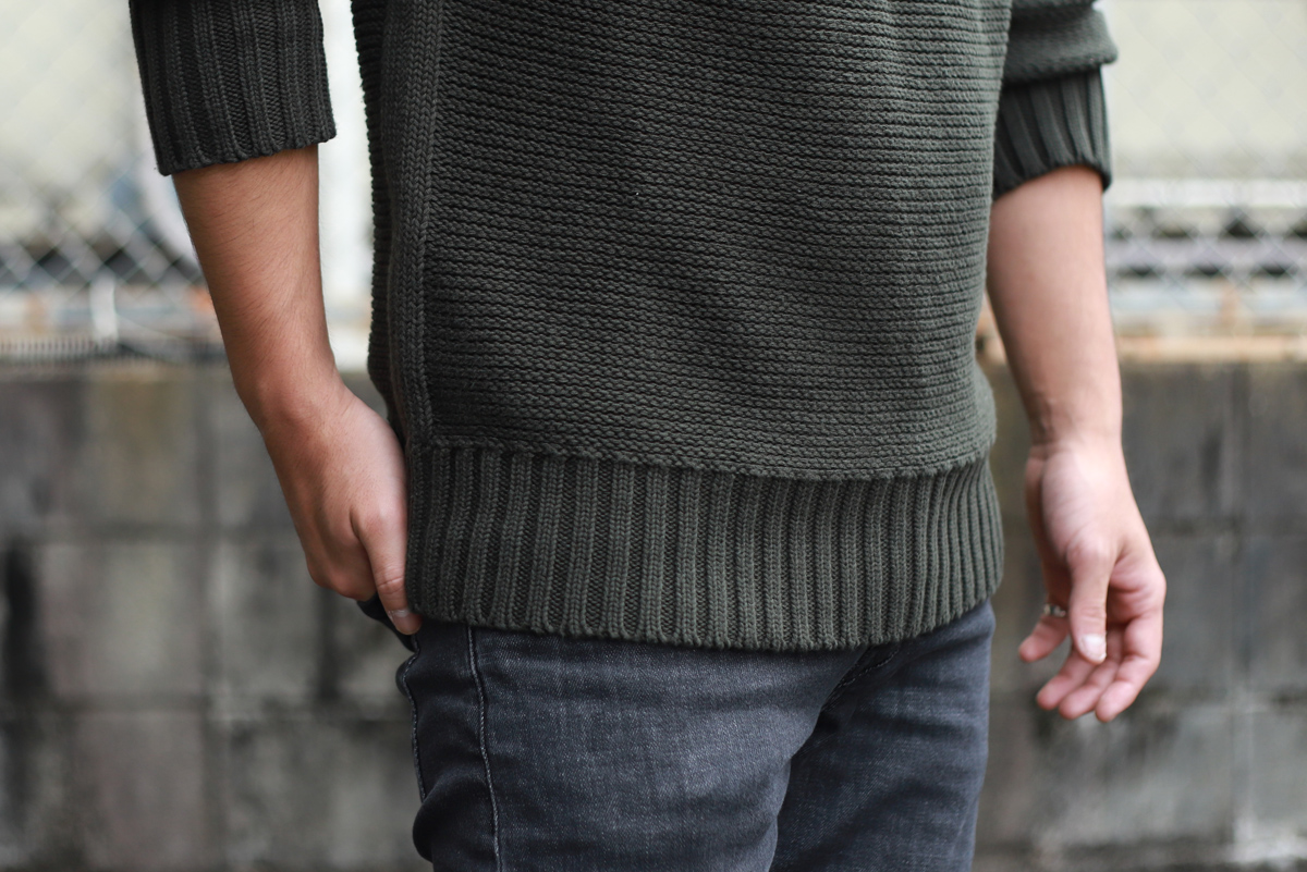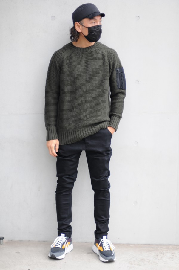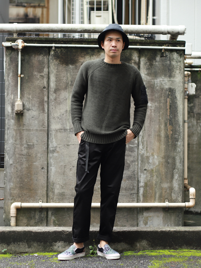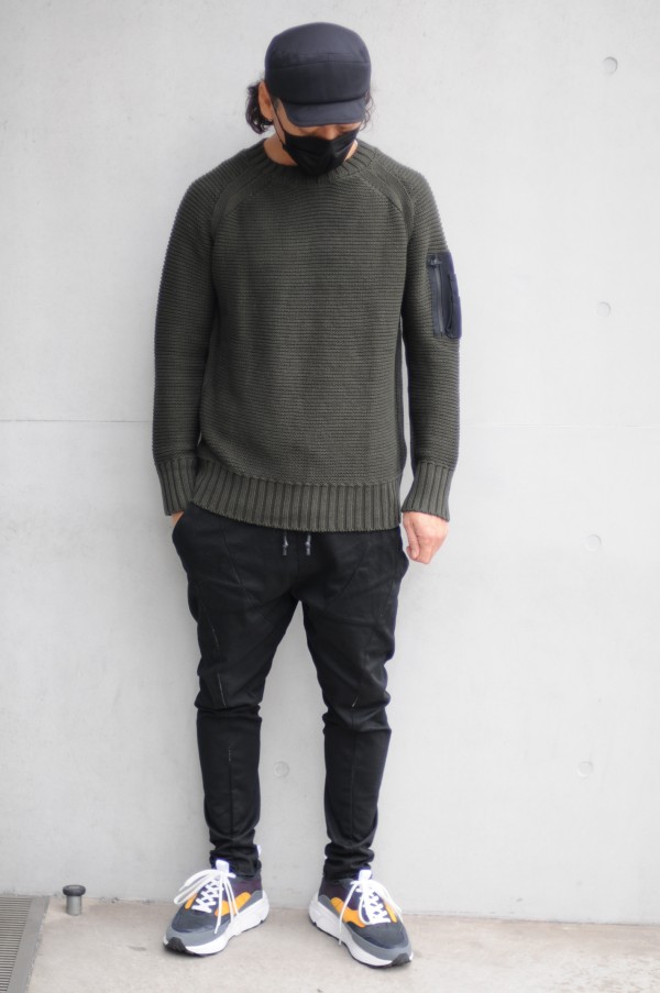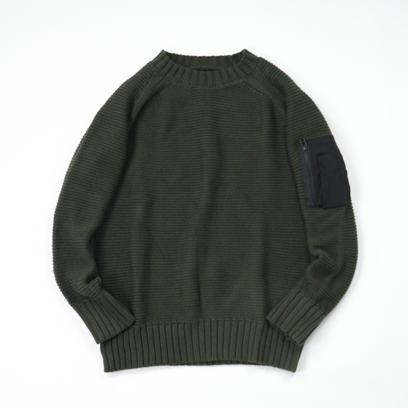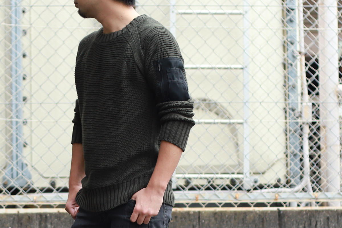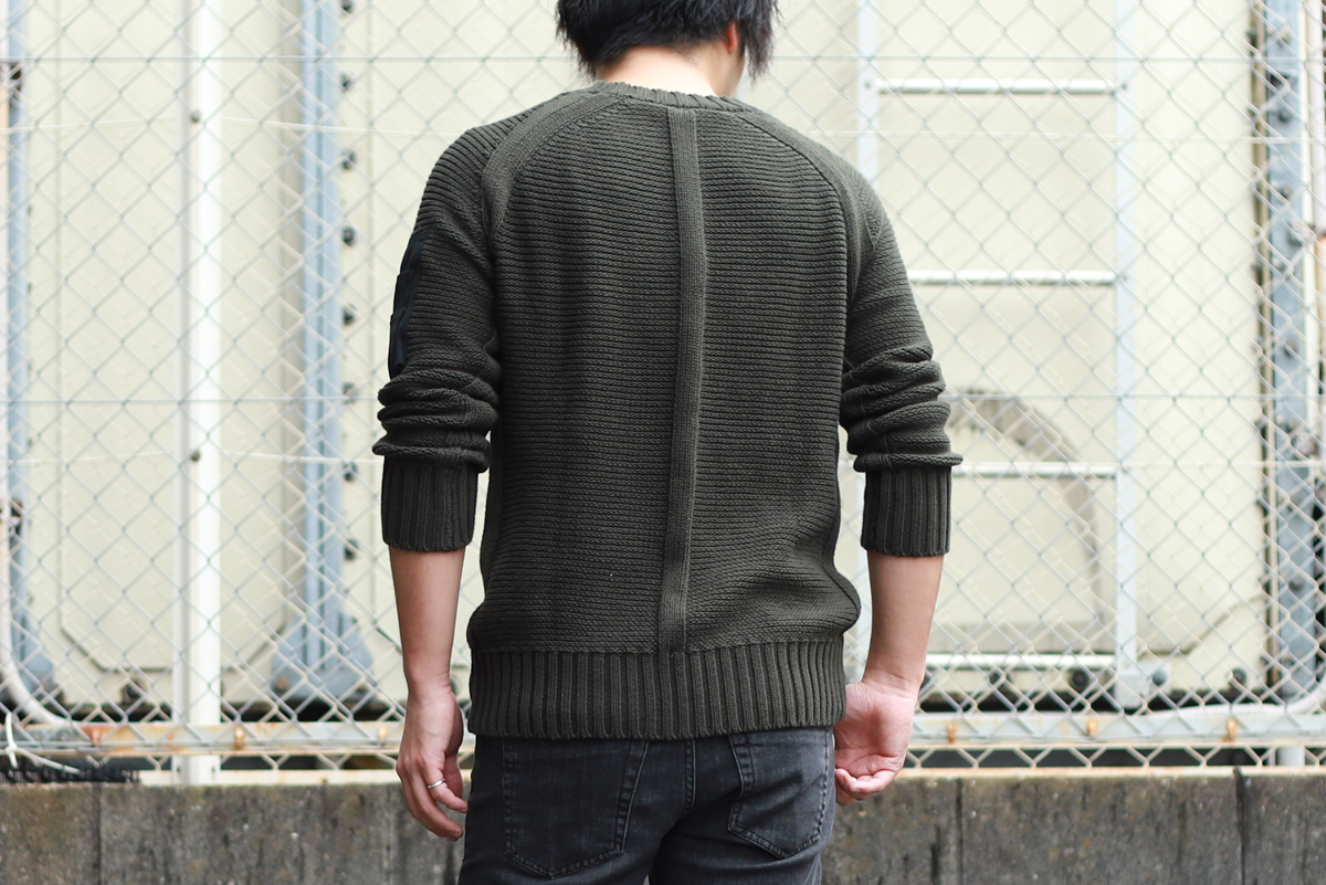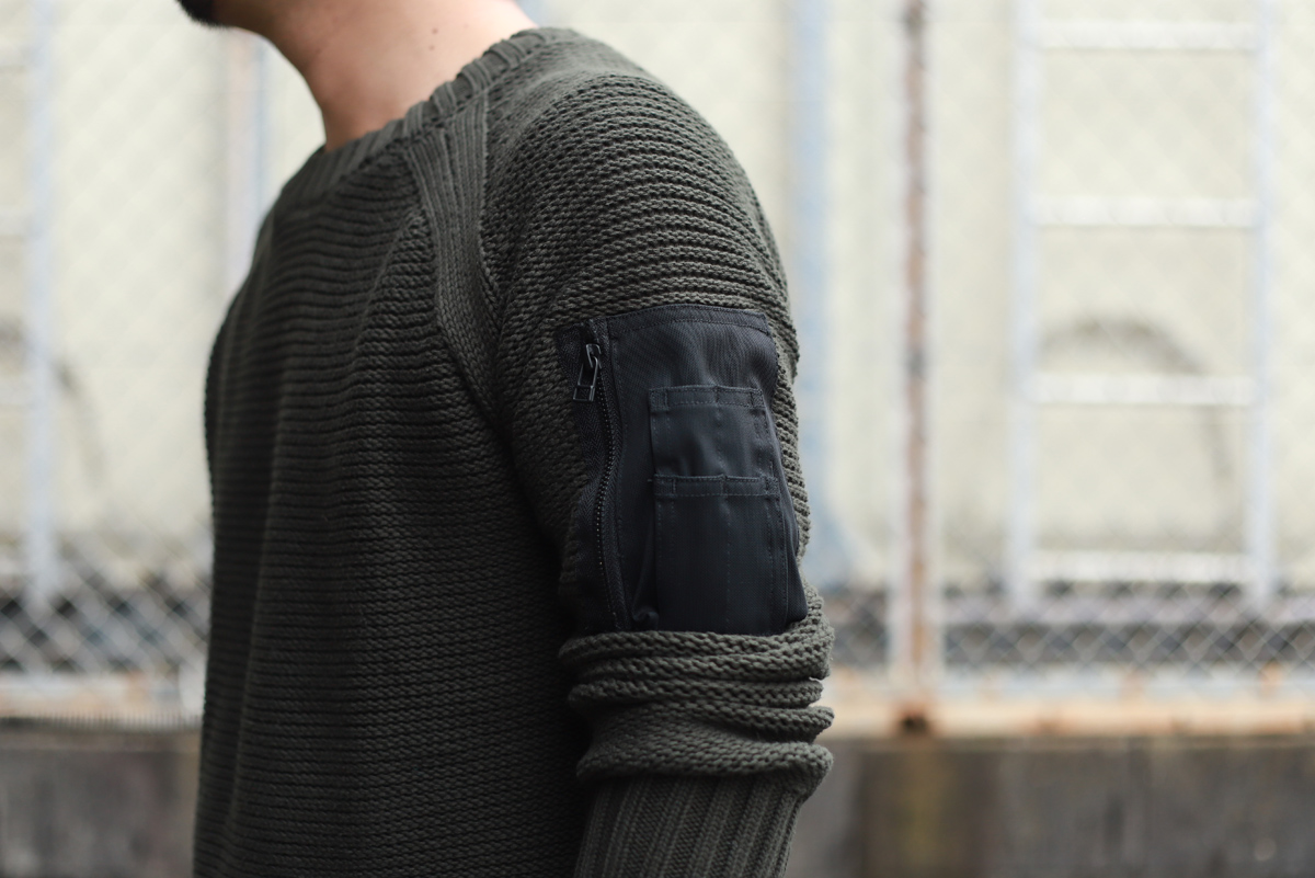 - 1枚で着用頂くことを想定してデザインされたニットですが、ミリタリーポケットにストレッチメッシュ素材を使ったことで、アウターを上から羽織っても”嵩張りにくい”仕上がりになりました。