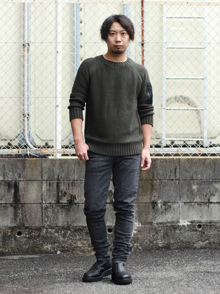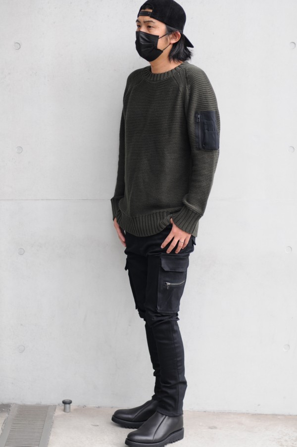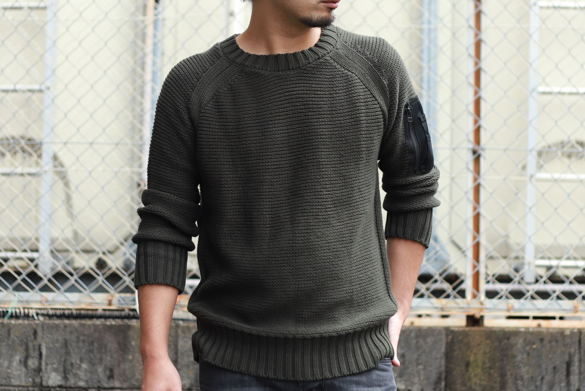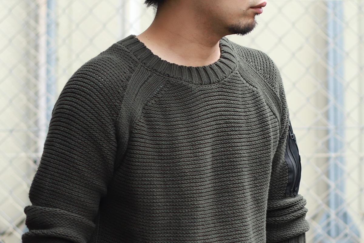 - ベースはブランドの根底にあるミリタリーに着目し、コンバットニットをリップ流に再構築。ディティール、デザインを最小限に抑えることで、左袖のミリタリーポケットディティールが際立つ1枚に。