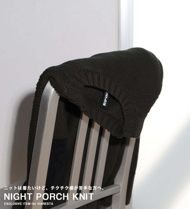 - 最大の特徴は別注NIGHT PORCH(R+191)のデザインを落とし込んだ左袖部分のミリタリーポケット。素材はパワーネットを採用。メッシュの中でも肉厚なストレッチメッシュ素材で、チープに見えないのが魅力でニットの素材感とも相性がいいです。