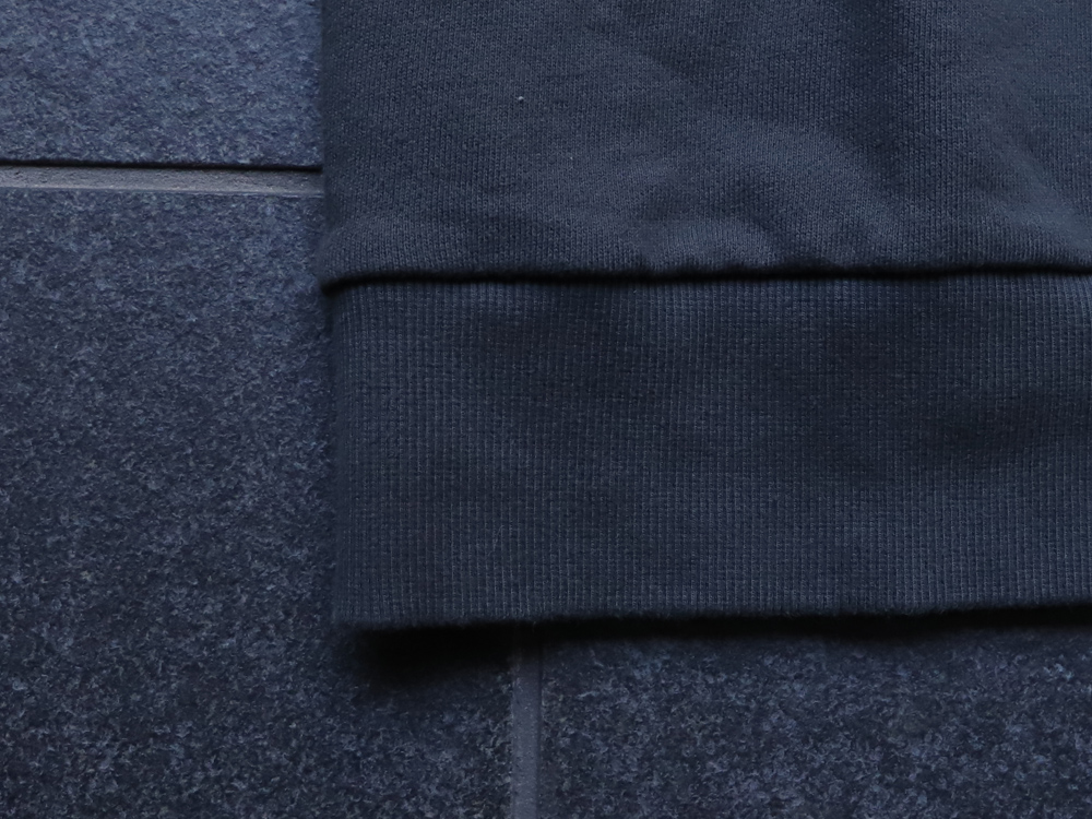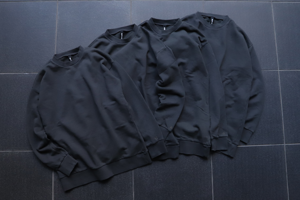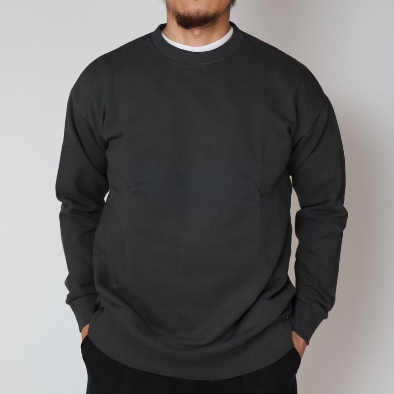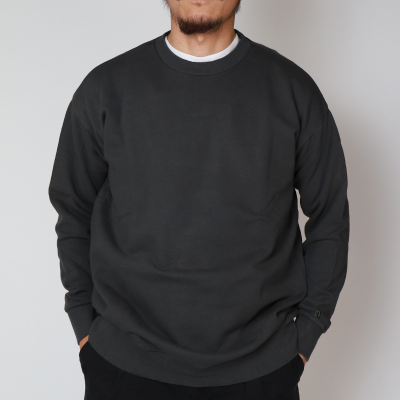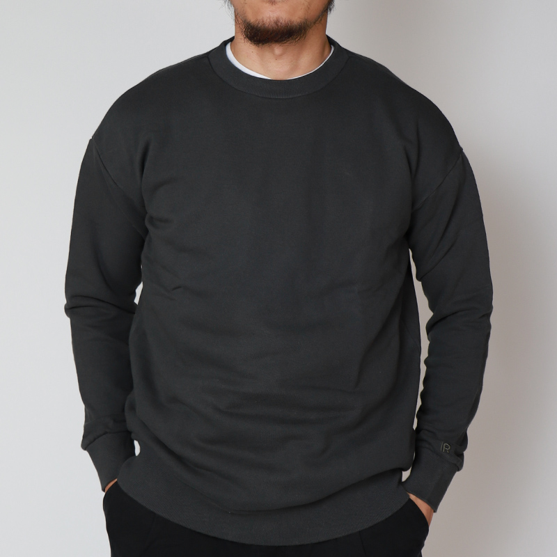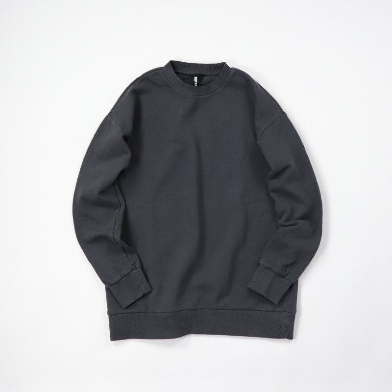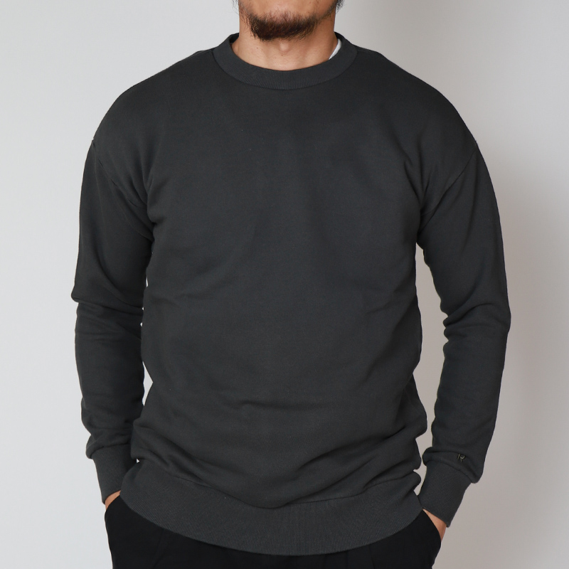 とは言え、一般的なスウェットのグレーですと、他ブランド含めてもしかしたら既にお持ちの方が多いのでは?と思い、チャコールよりもほんの少しトーンが薄いグレー(オスミウムグレー)にしました。こちらは製品染め(製品が完成した後に染める工程)を施し、さらに極力色落ちしないよう、ワンウォッシュをかけています。