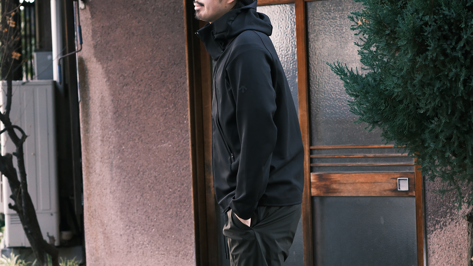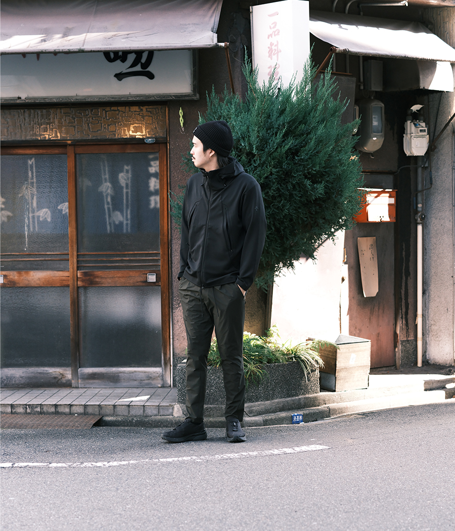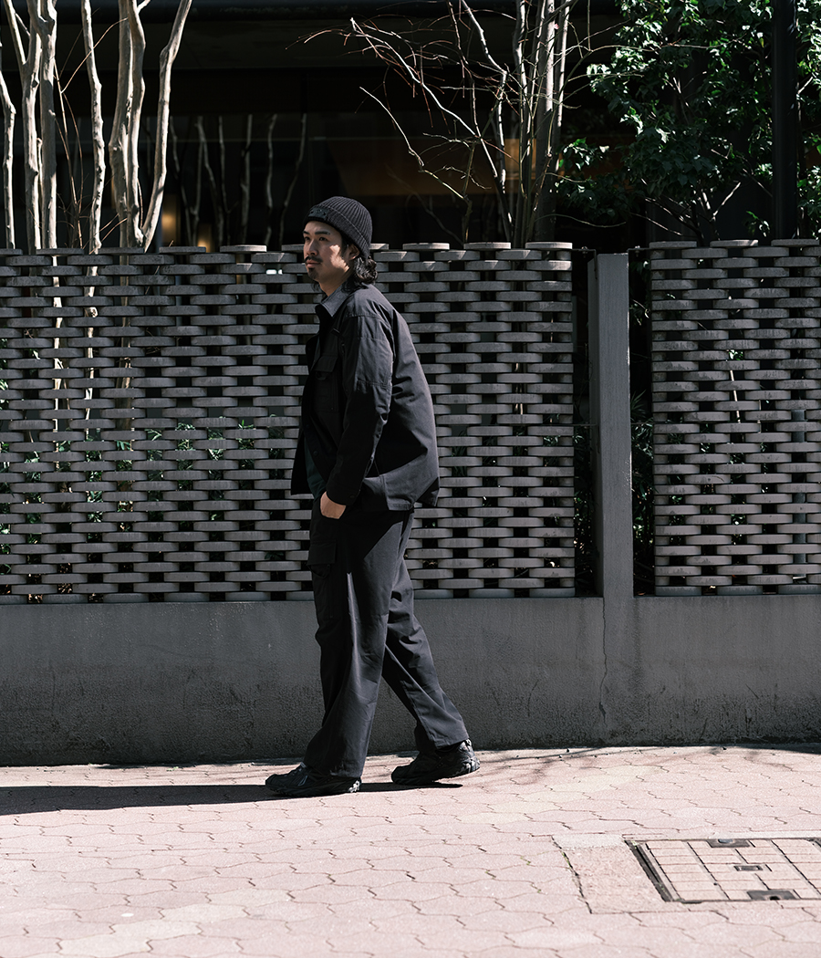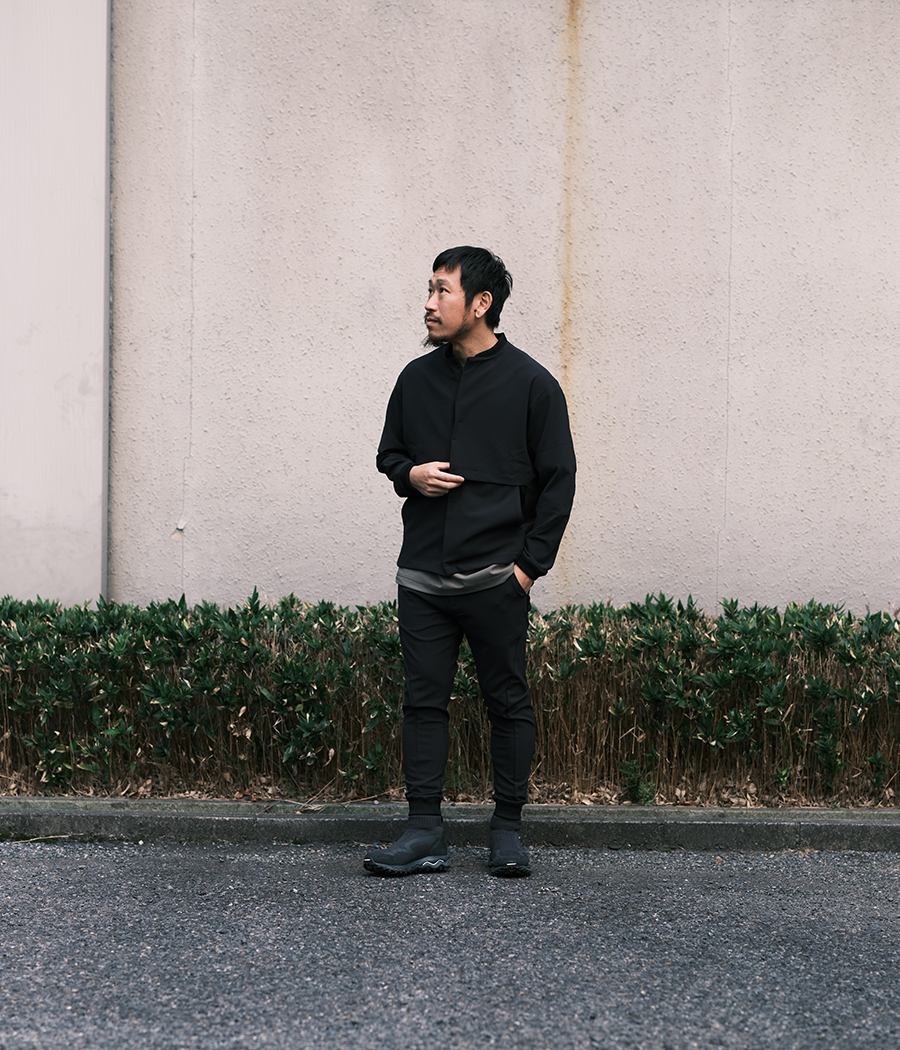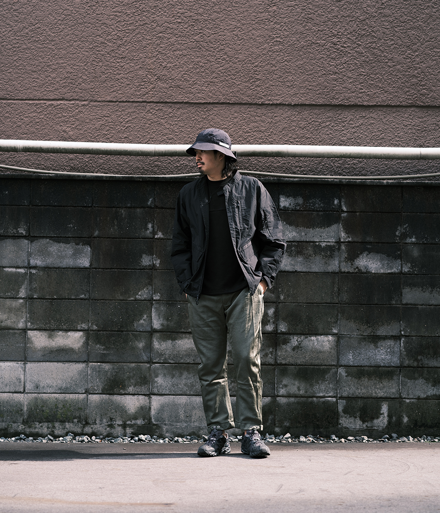 上下同じ素材のモノ(セットアップ)を着るだけで容易にそれっぽい雰囲気が出せるので、最近はセットアップばかり着ています。そんな中、RIPVANWINKLEから「グングン伸びる」「乾きが早い」「冷んやりしてて気持ちいい」の三拍子揃ったセットアップが入荷してきました。インナーにはDESCENTEの高機能Tシャツを取り入れました。ブラックとカーキの相性は鉄板ですが、やはり好きな組み合わせです。