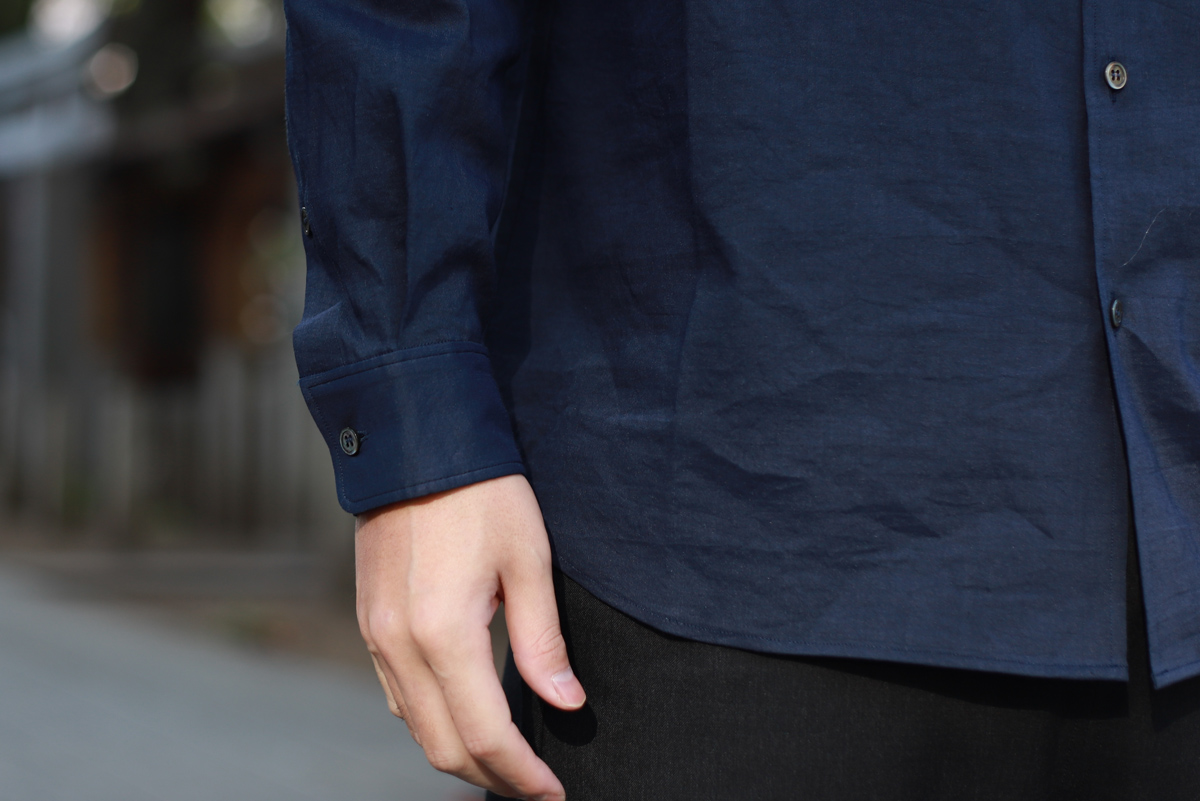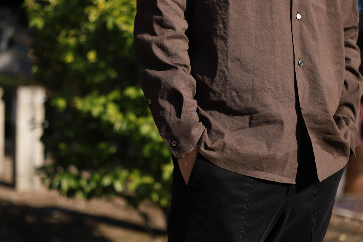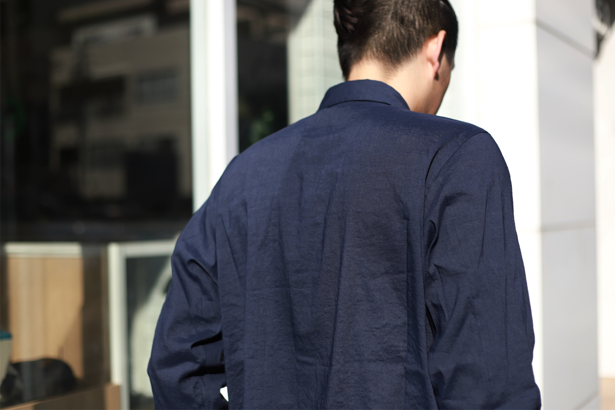 - 塩縮リネンシャツが裏地付きに対してこちらは一重(裏地なし)で仕上げていますので、その分リラックス感のあるフィッティングを感じて頂けます。