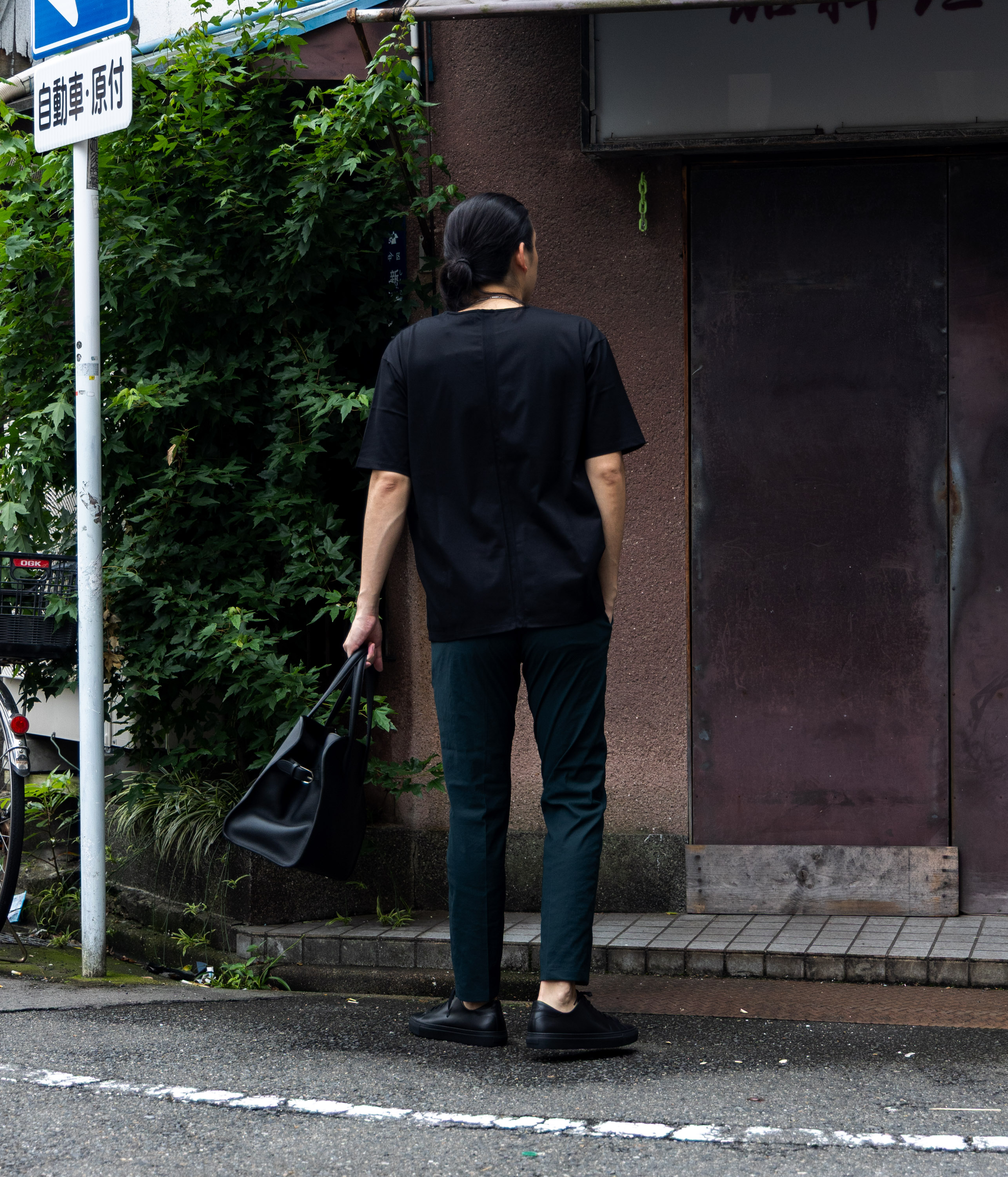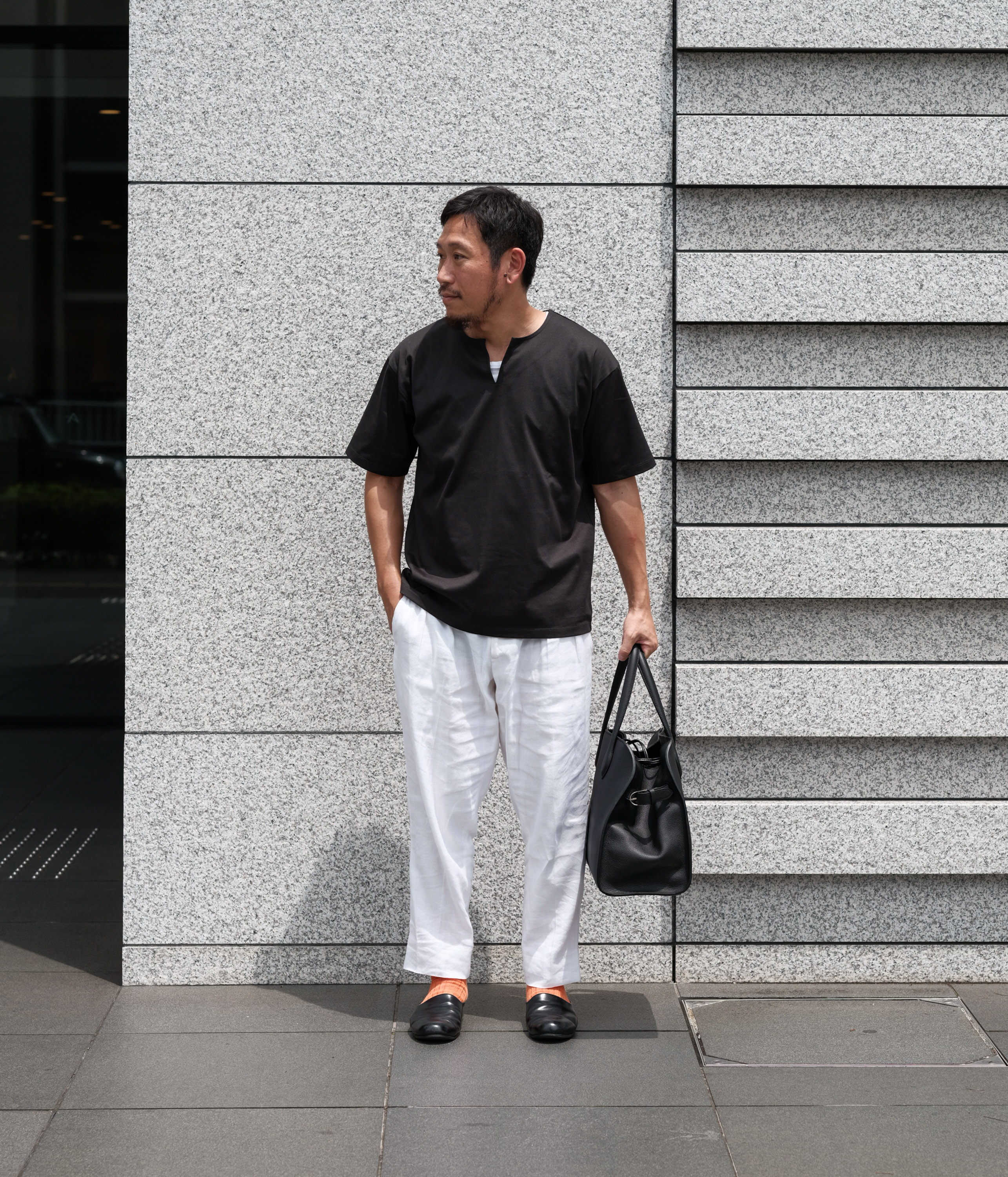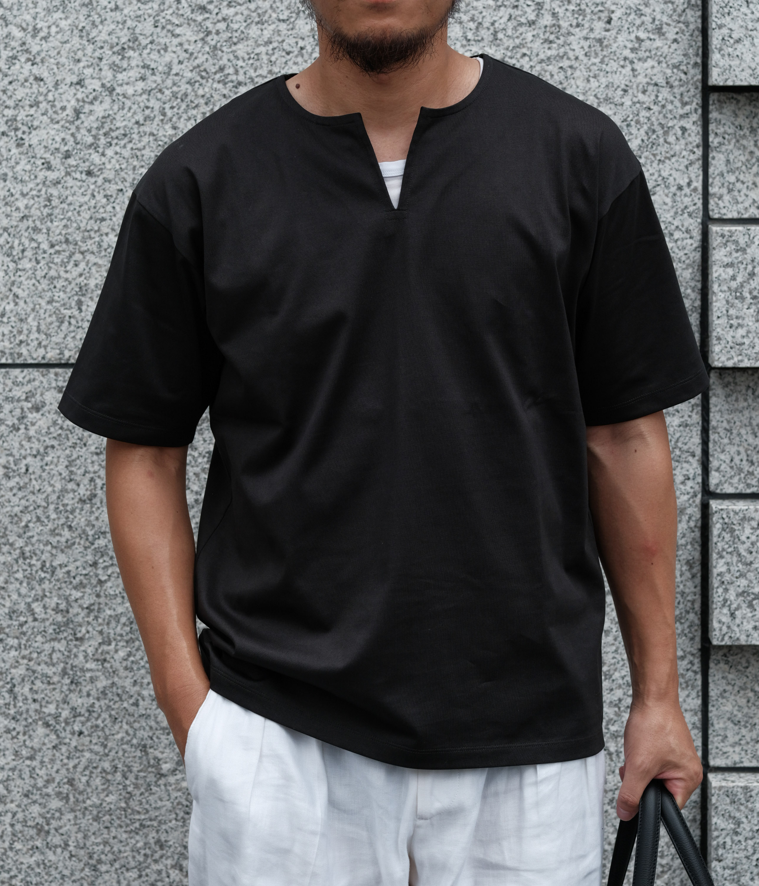 2年前に即完売したスリットTを改良し、夏の定番ワイドパンツやショーツにぴったり合うシルエットになるようこだわって製作しました。