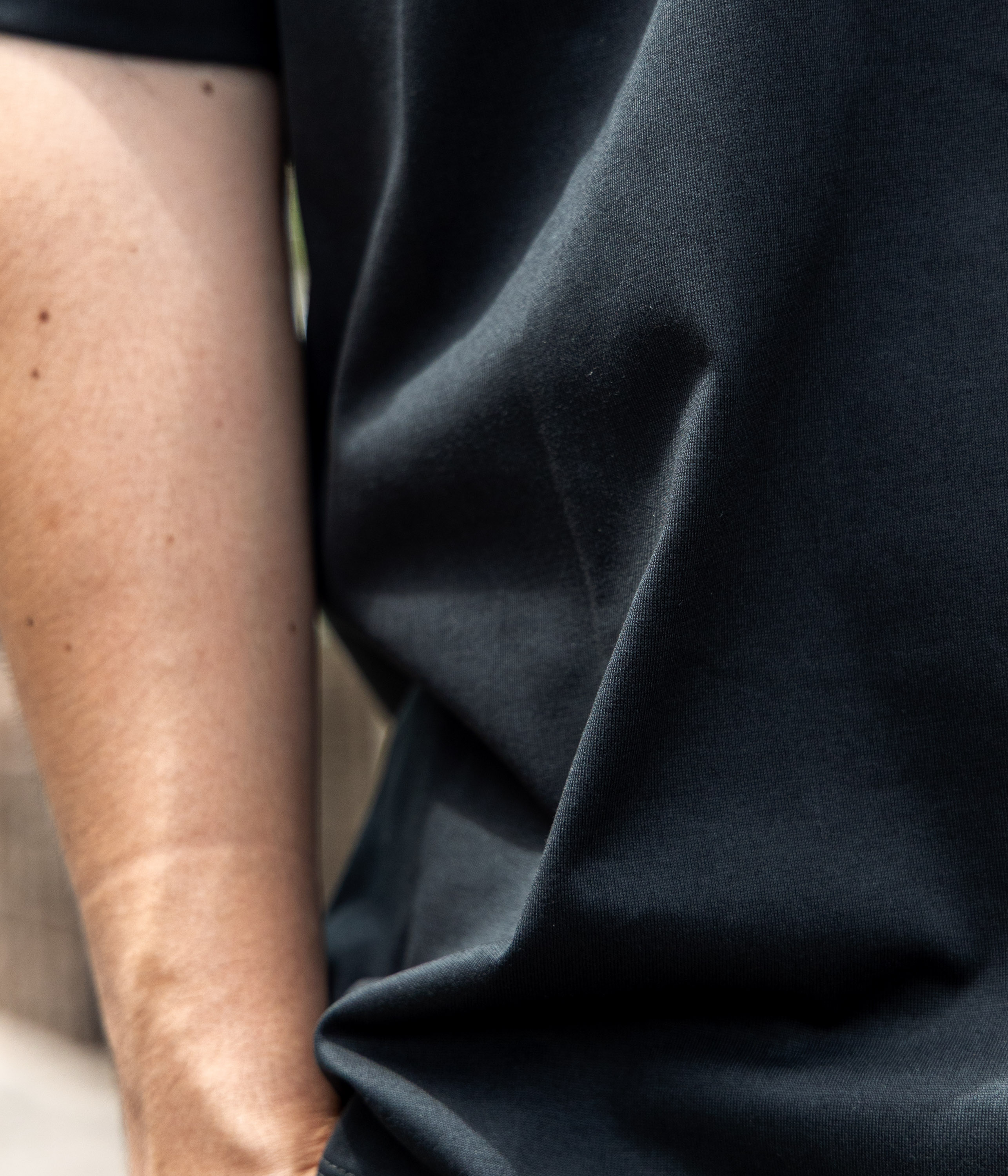 Tシャツは夏に繰り返し着用するため、100回洗える定番ファブリック「シルケット加工を施した、ハイゲージのコンパクト天竺素材」を採用しています。