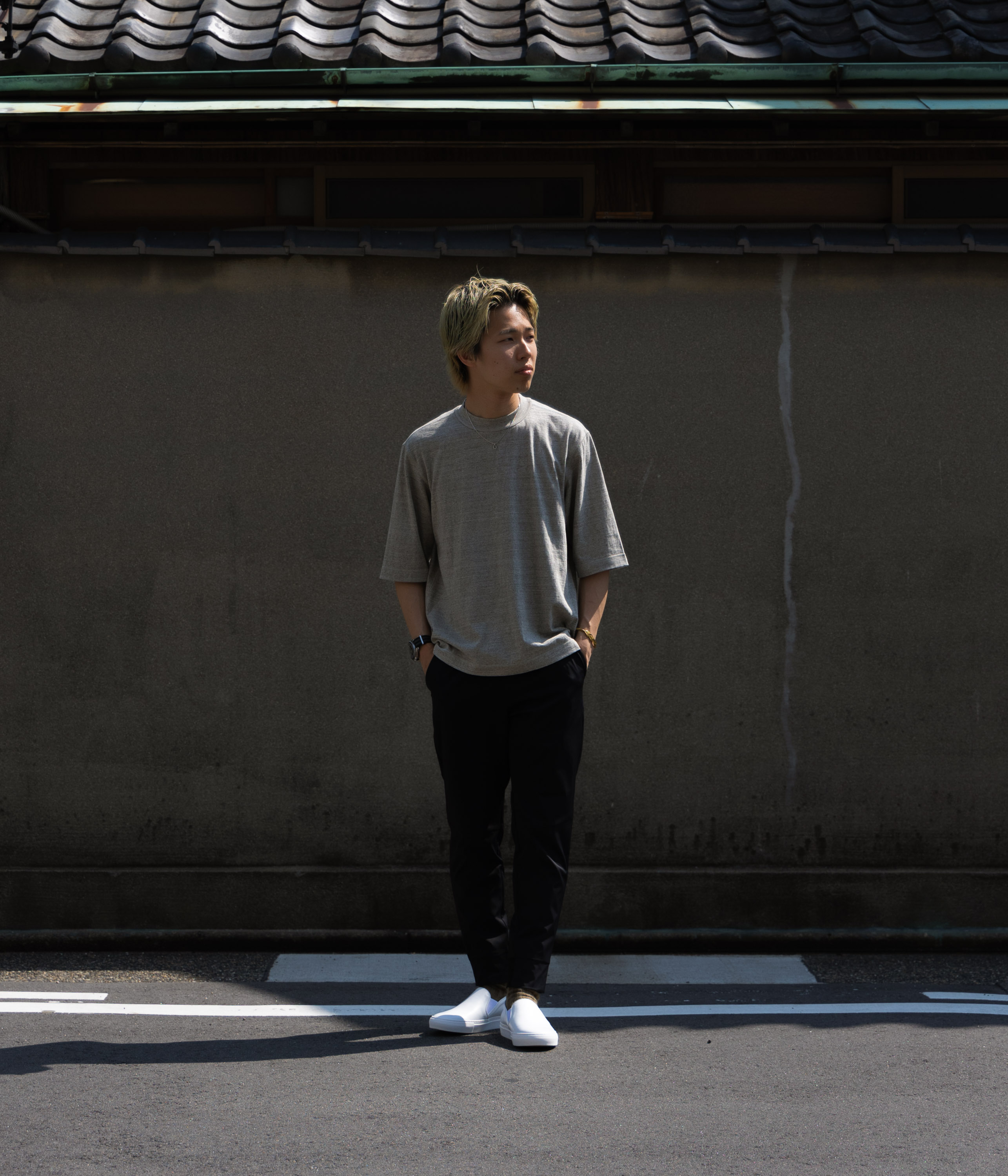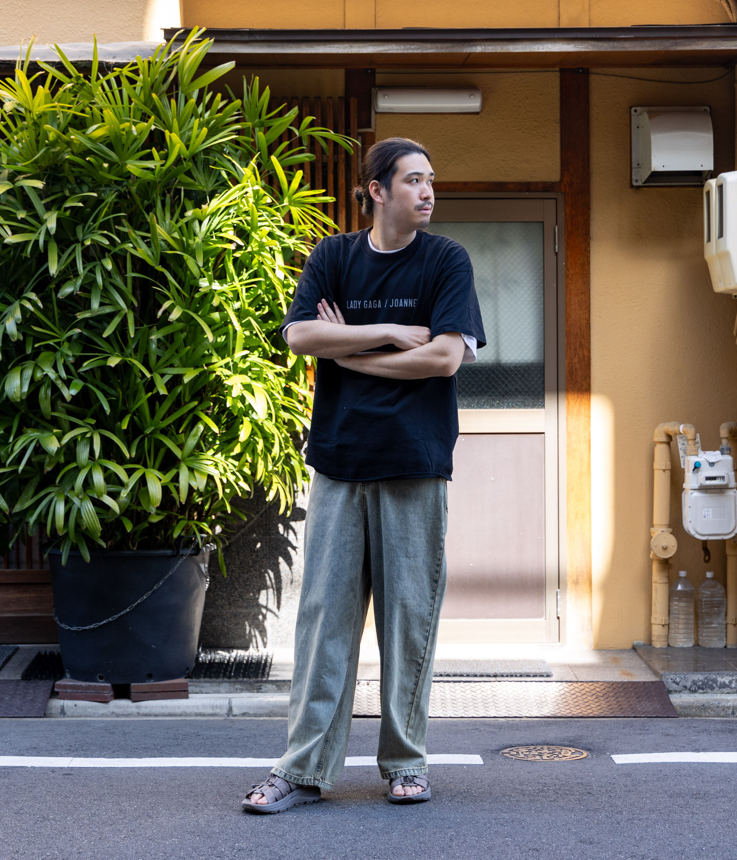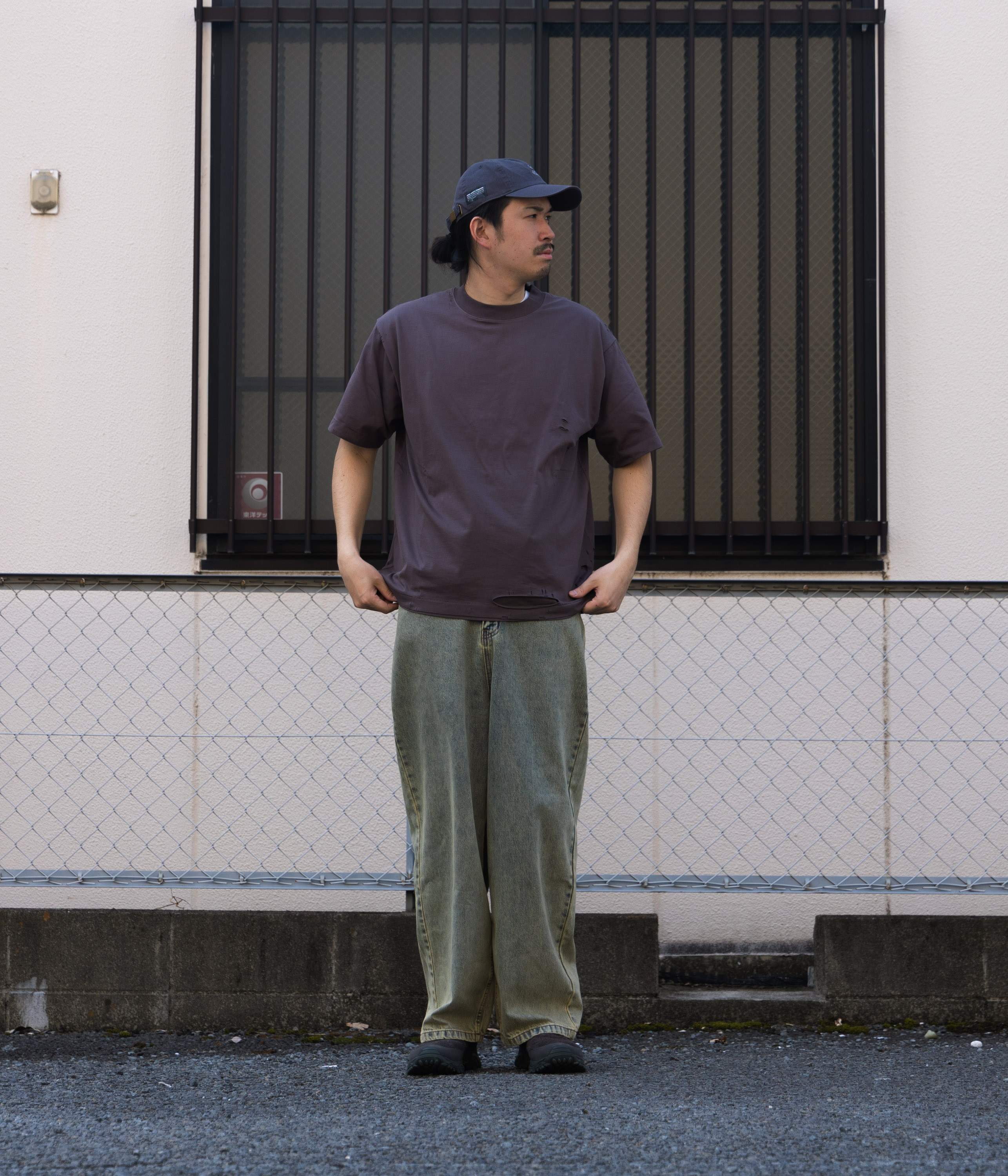 ダメージ加工が施されたTシャツに、ウォッシュのかかったデニムで合わせたカジュアルスタイル。キャップや足元のチャコールグレーで統一感を出し、淡いデニムで夏感を強めました。デニムの生地はやや厚めですが、ワイドシルエットで夏もストレスなく着用可能です。