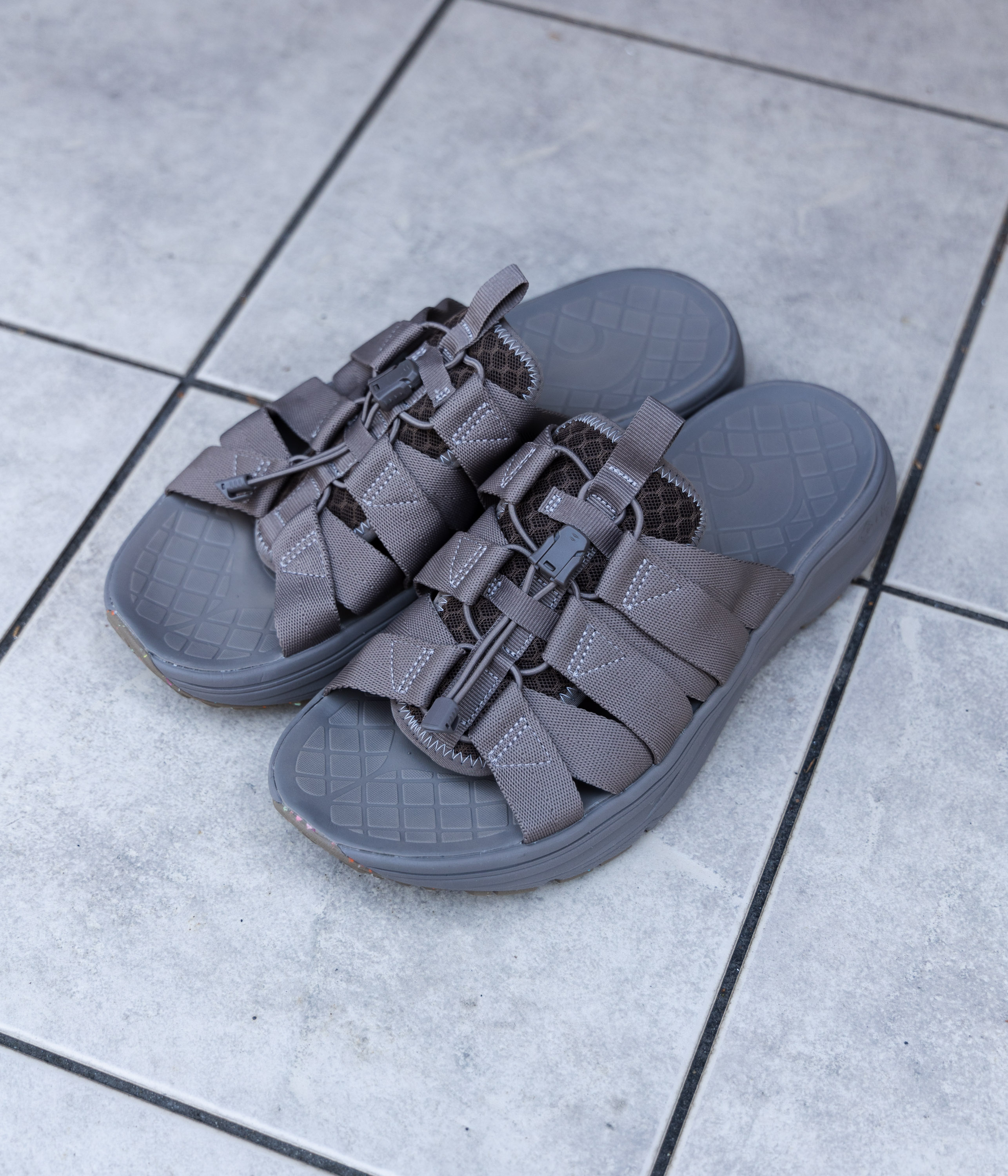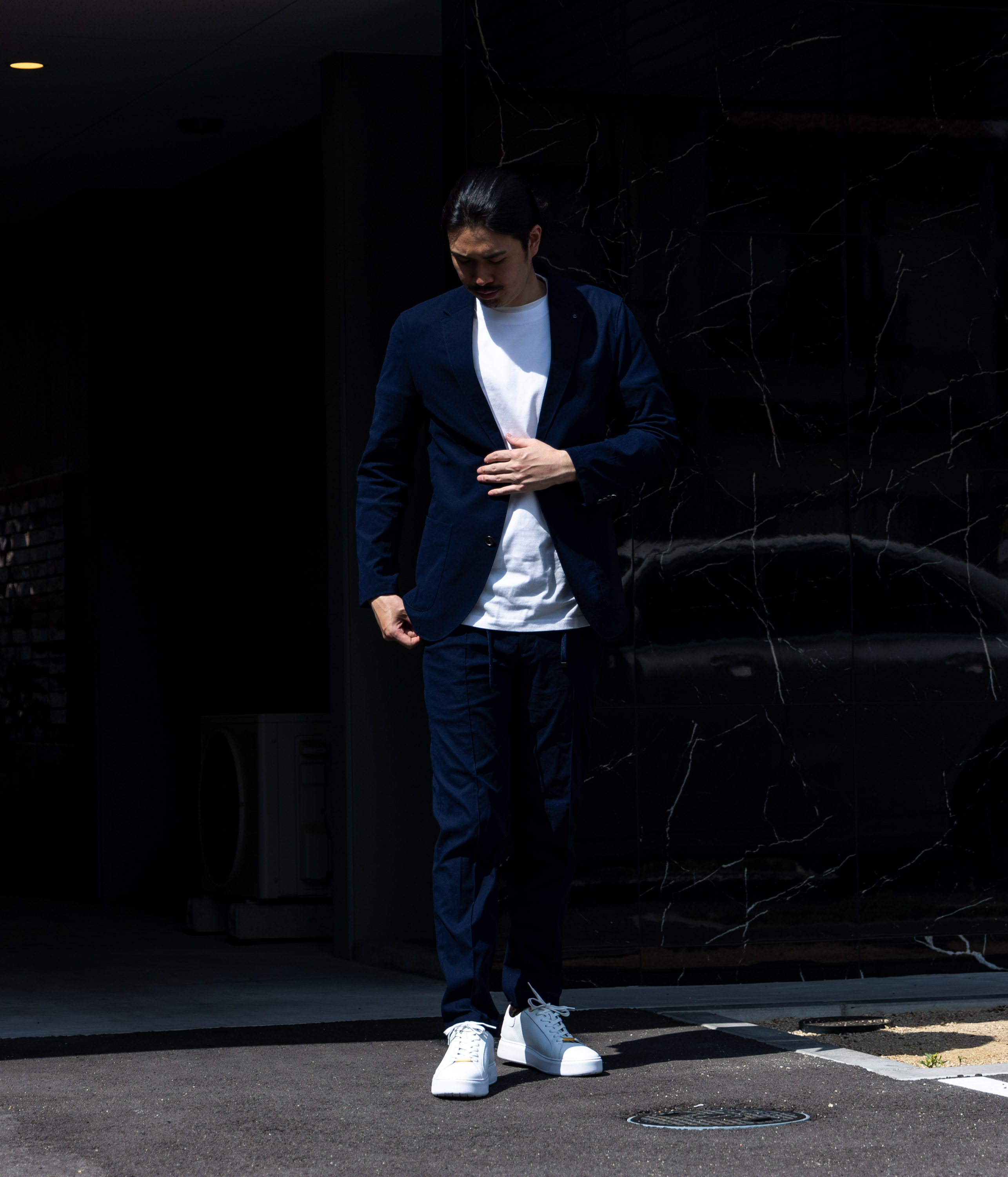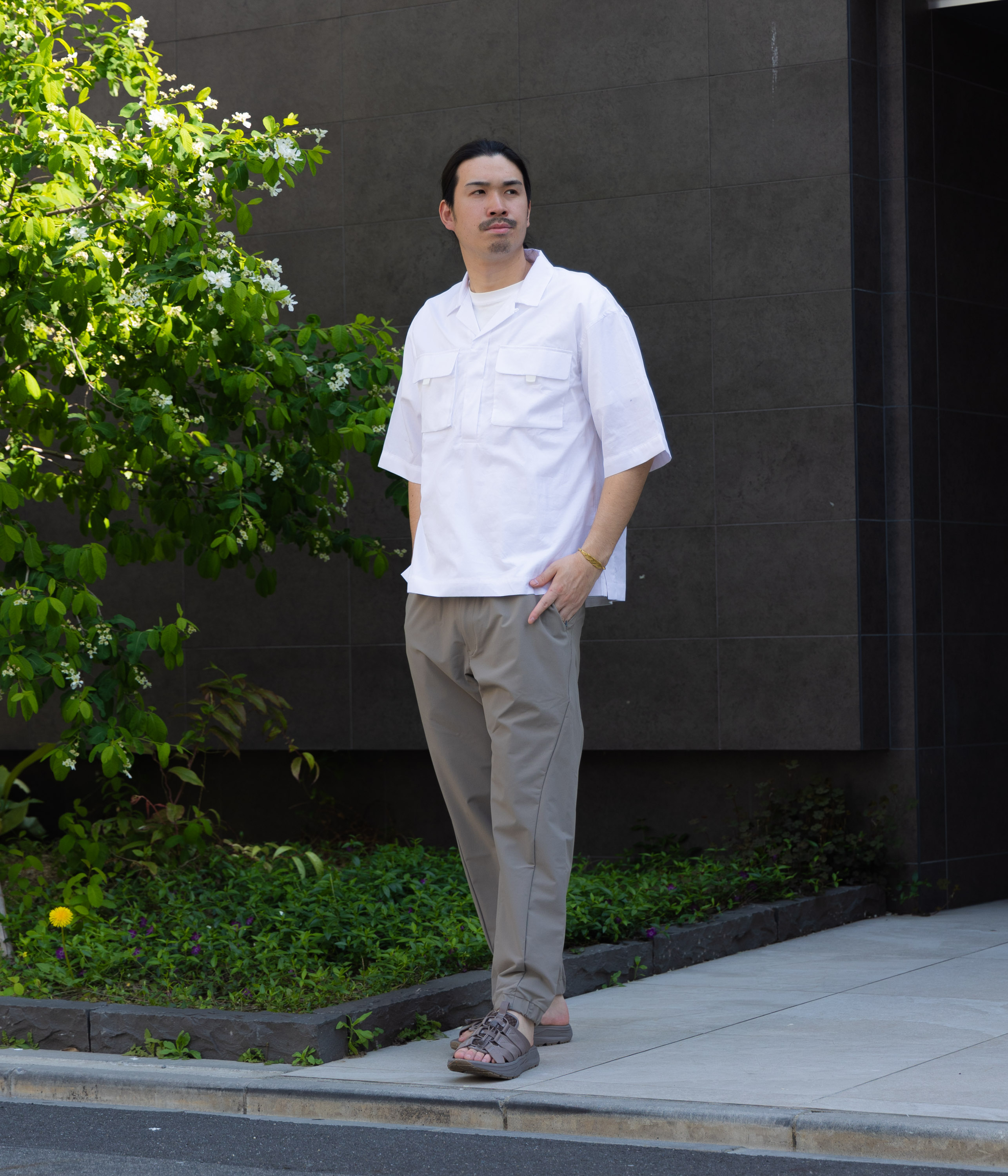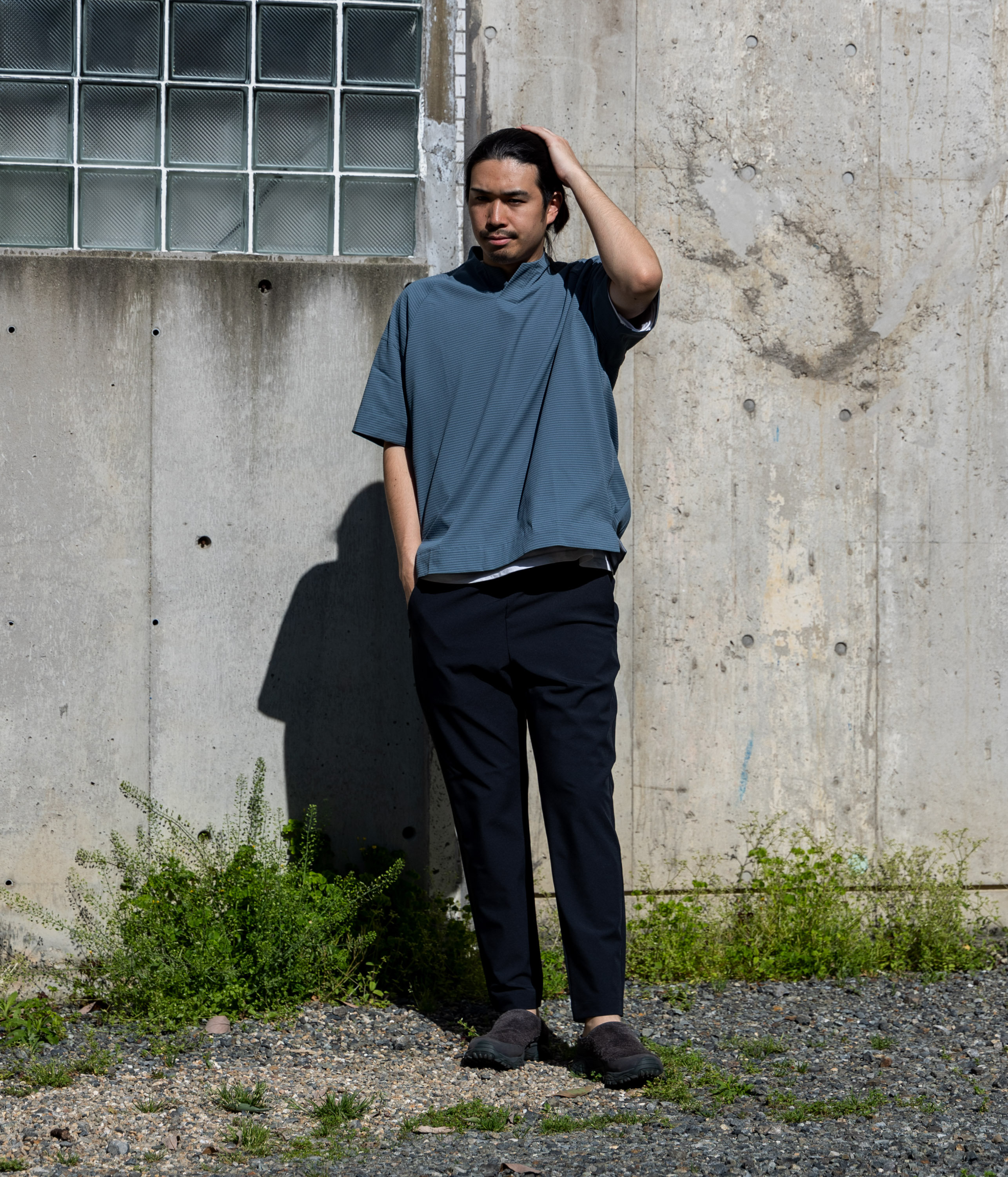 ダメージ加工が施されたTシャツに、ウォッシュのかかったデニムで合わせたカジュアルスタイル。キャップや足元のチャコールグレーで統一感を出し、淡いデニムで夏感を強めました。デニムの生地はやや厚めですが、ワイドシルエットで夏もストレスなく着用可能です。