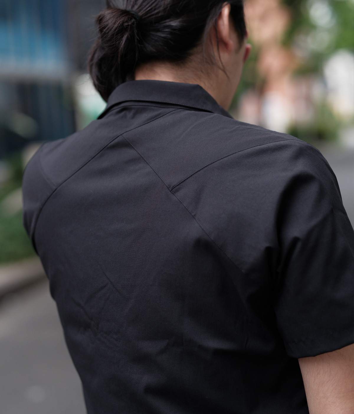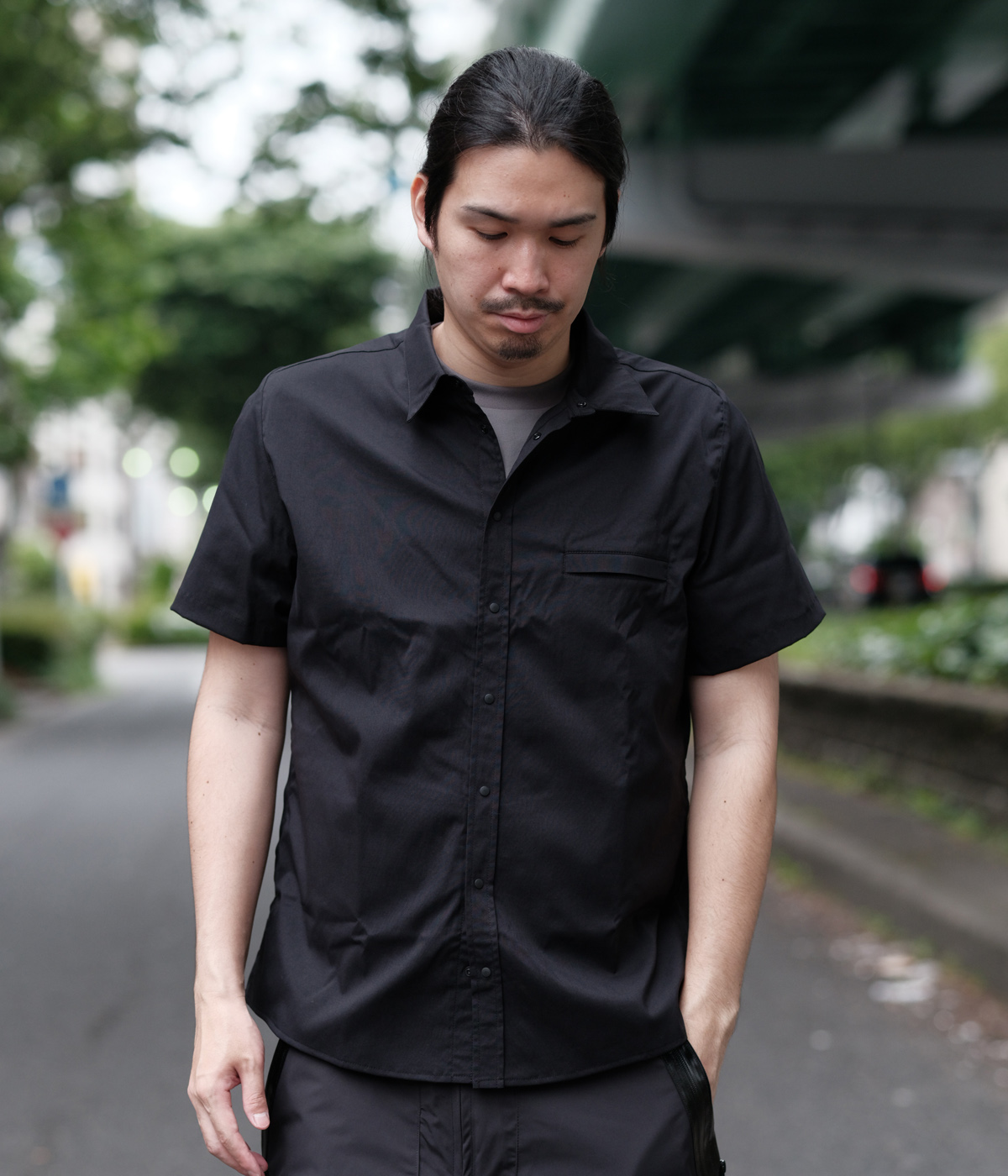 / tilak撥水性、透湿性、ストレッチ性に富んだシャツ。生地感はマットで少し表情があるファブリックと同色スナップボタンが特徴。